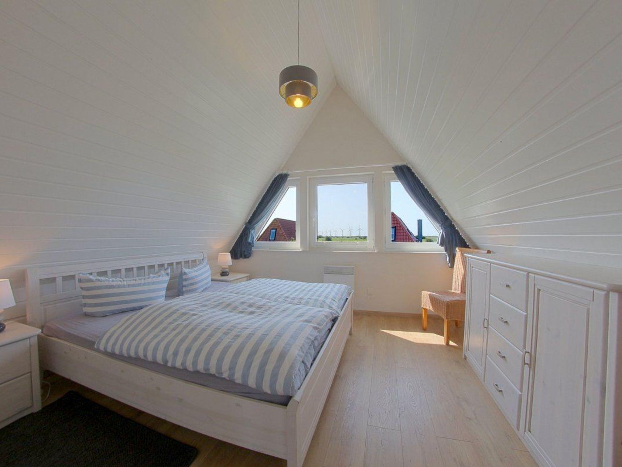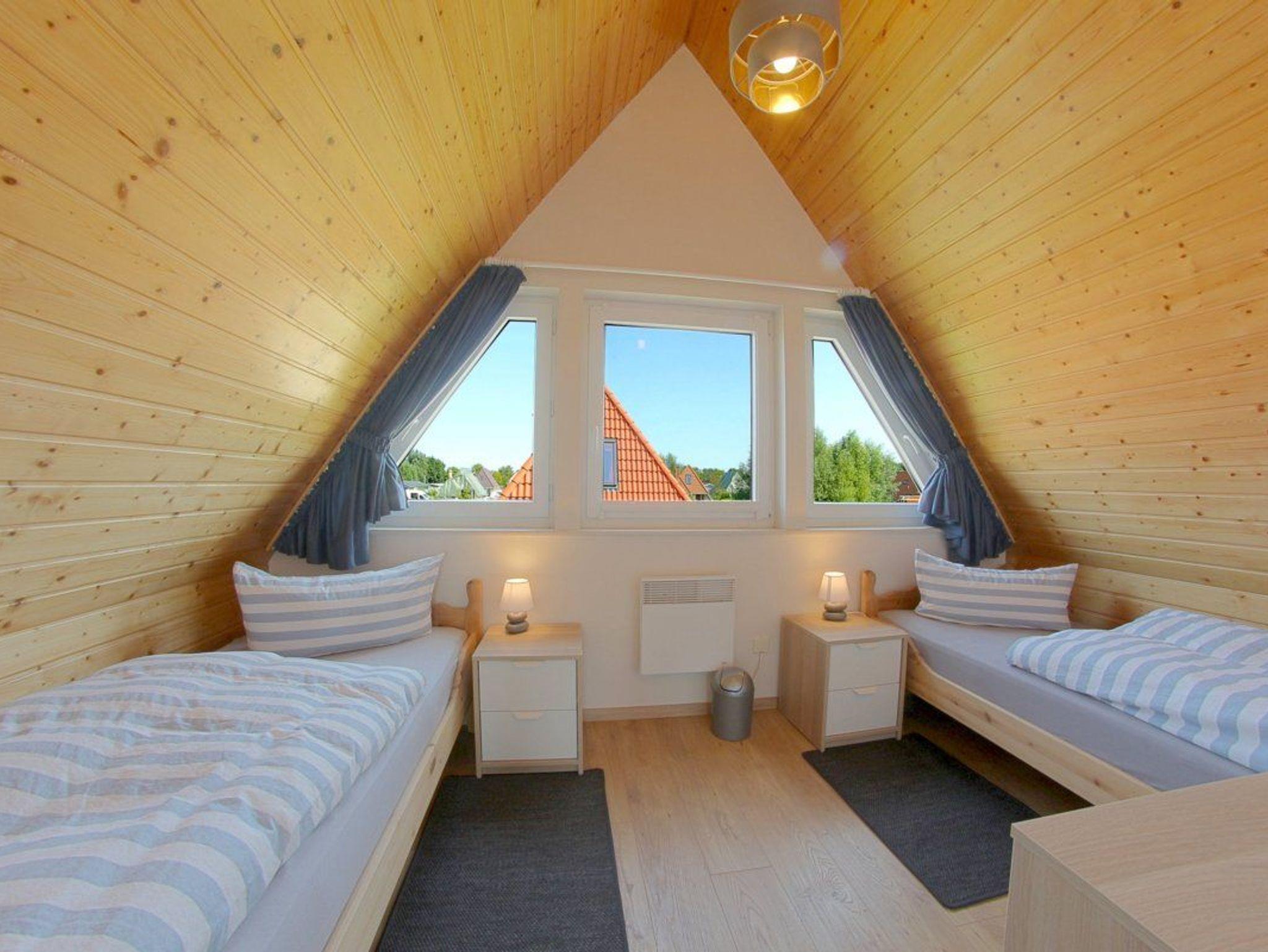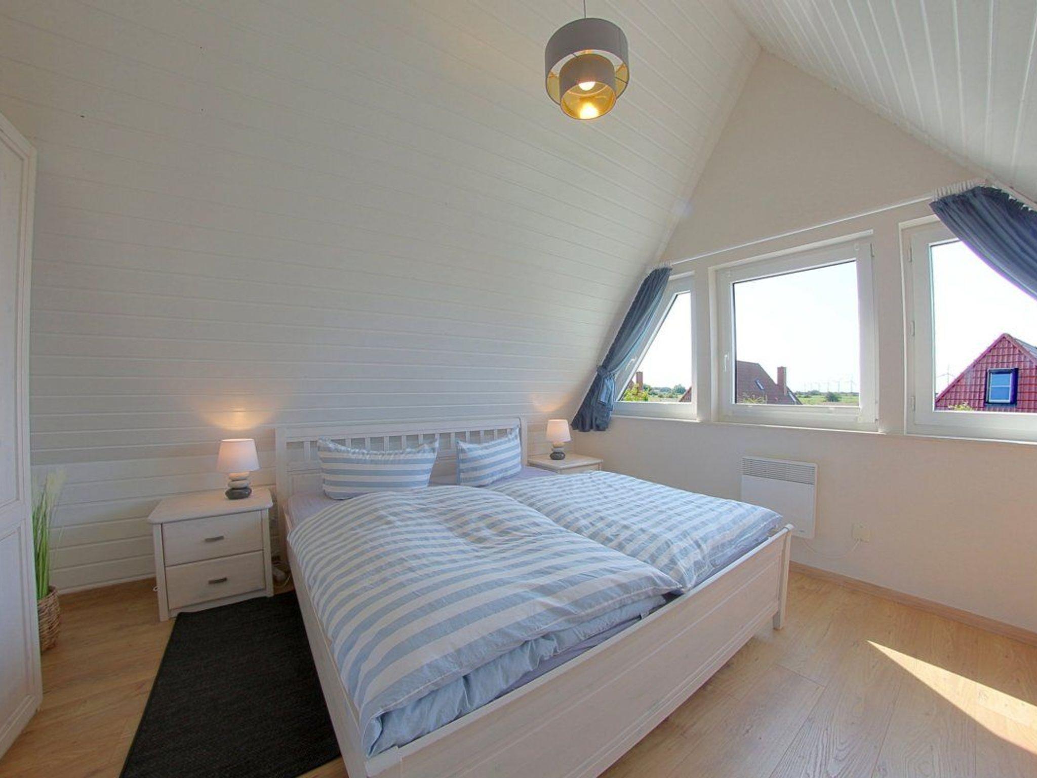 Im Obergeschoss finden Sie 2 Schlafzimmer, eins mit Doppelbett und ein weiteres mit 2 Einzelbetten.
