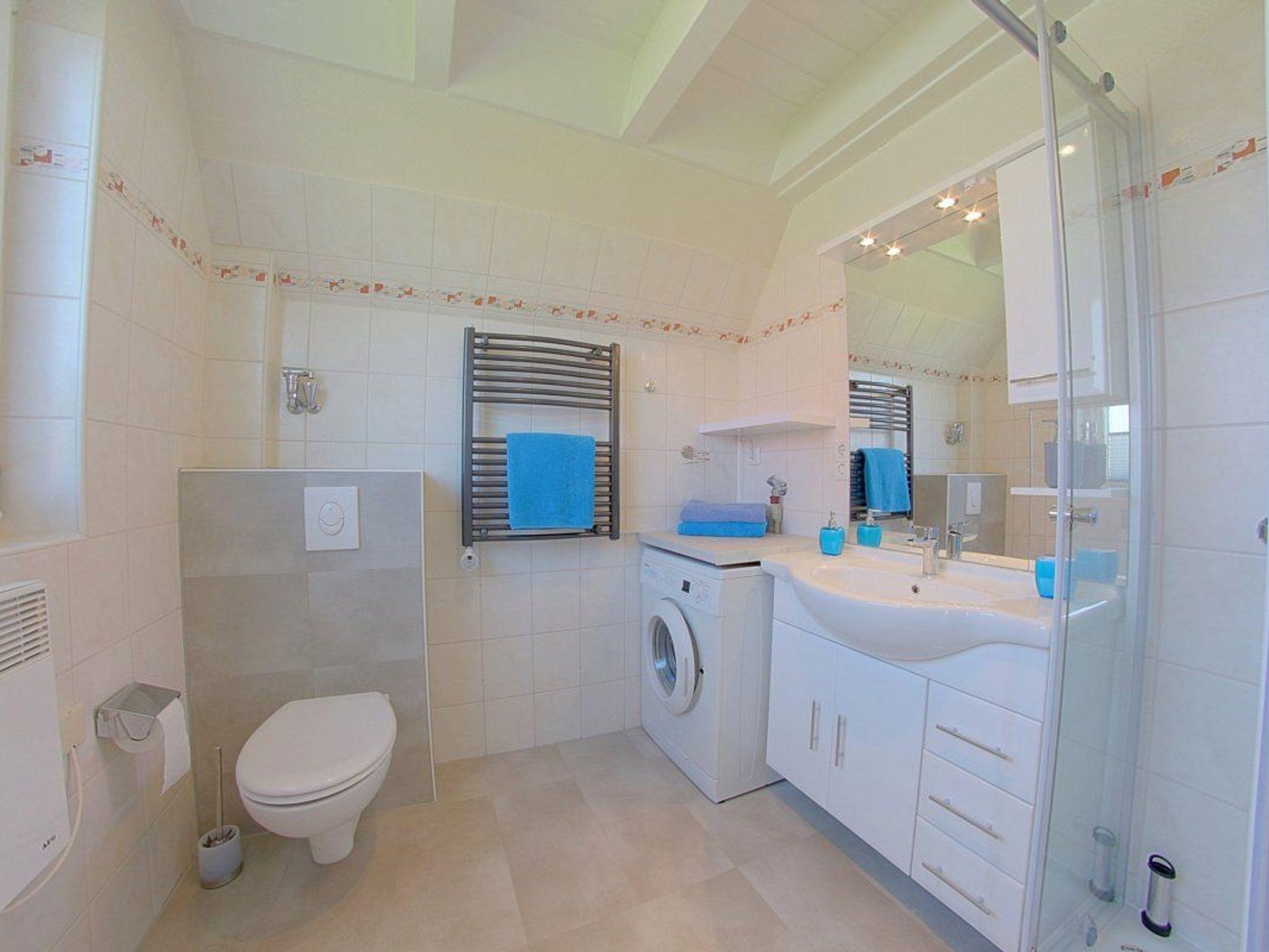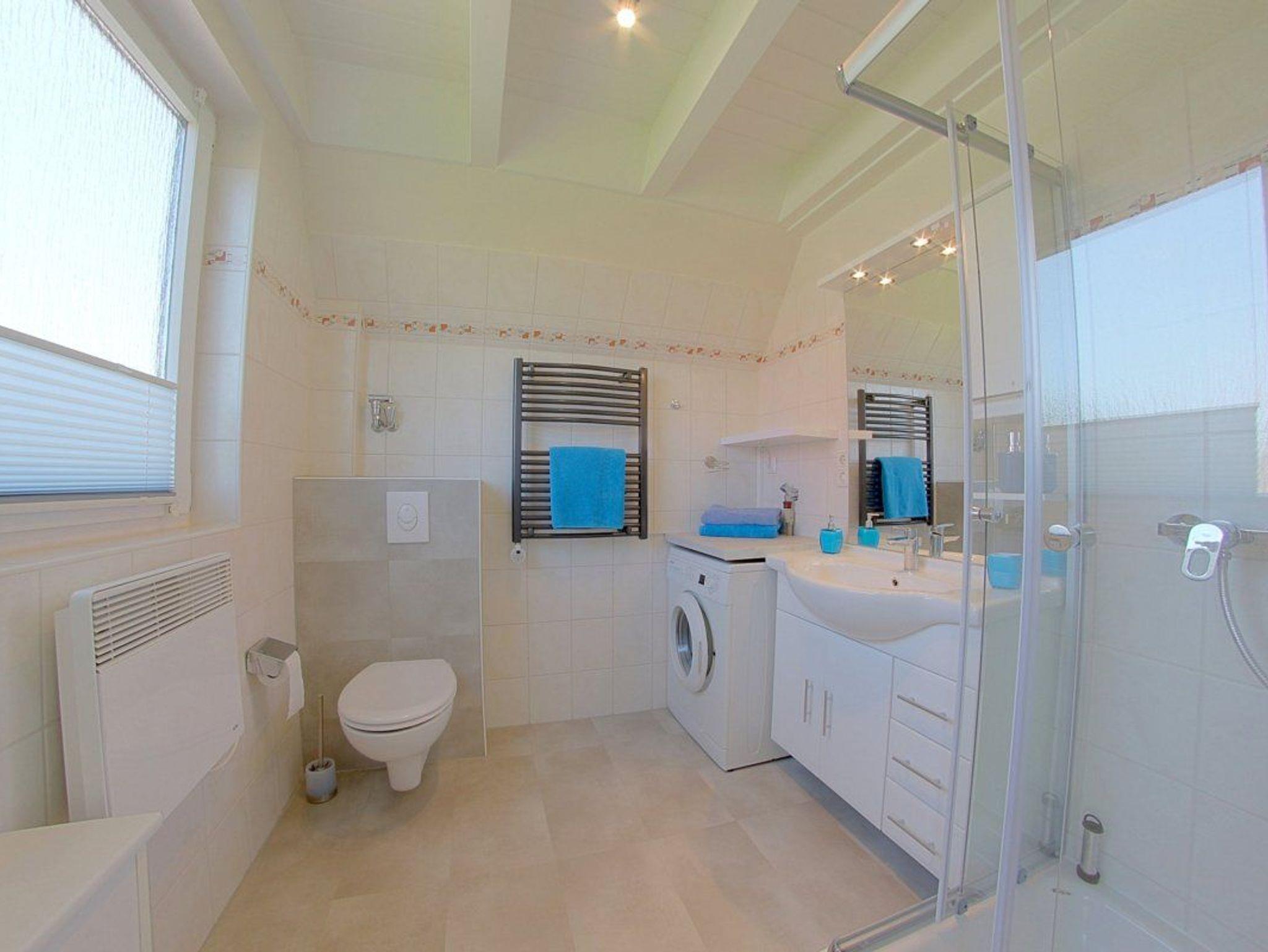 Ebenfalls im Erdgeschoss befindet sich das moderne Duschbad mit Waschmaschine und Fenster. Das Erdgeschoss ist komplett gefliest.