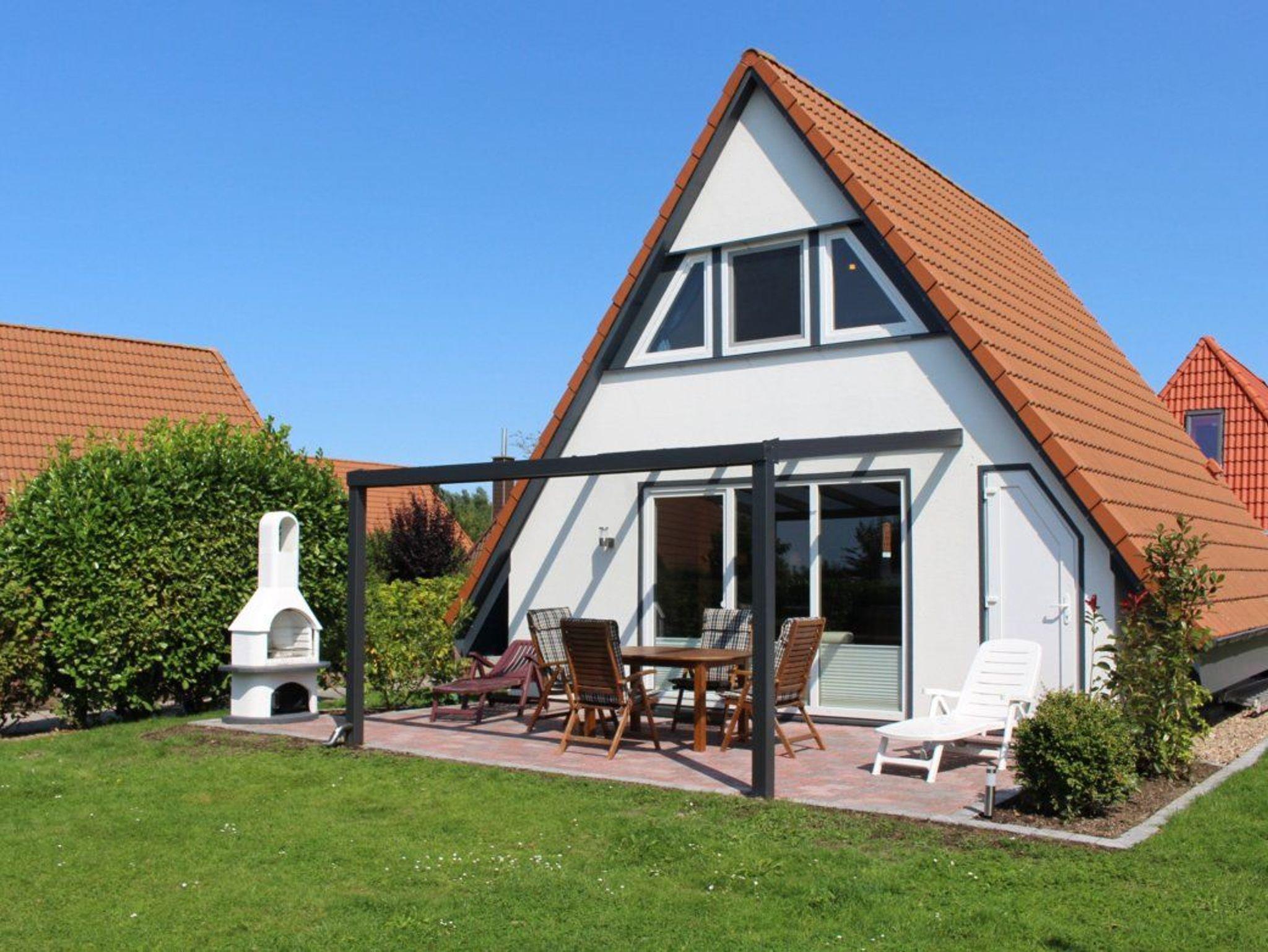 Modernes Ferienhaus im gepflegten Park nahe Strand, mit Kamin, Terrasse und eingezäuntem Garten für Hunde.