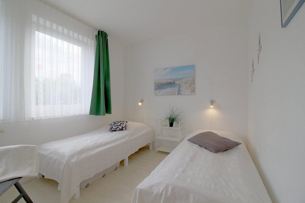 Zwei geräumige Schlafzimmer, eins mit Boxspringbett 180 x 2,00 m und eins mit 2 Einzelbetten bieten Platz für bis zu 4 Personen. Ein Babyreisebett steht ebenfalls bereit. Bettwäsche und Handtücher können dazugebucht werden.
