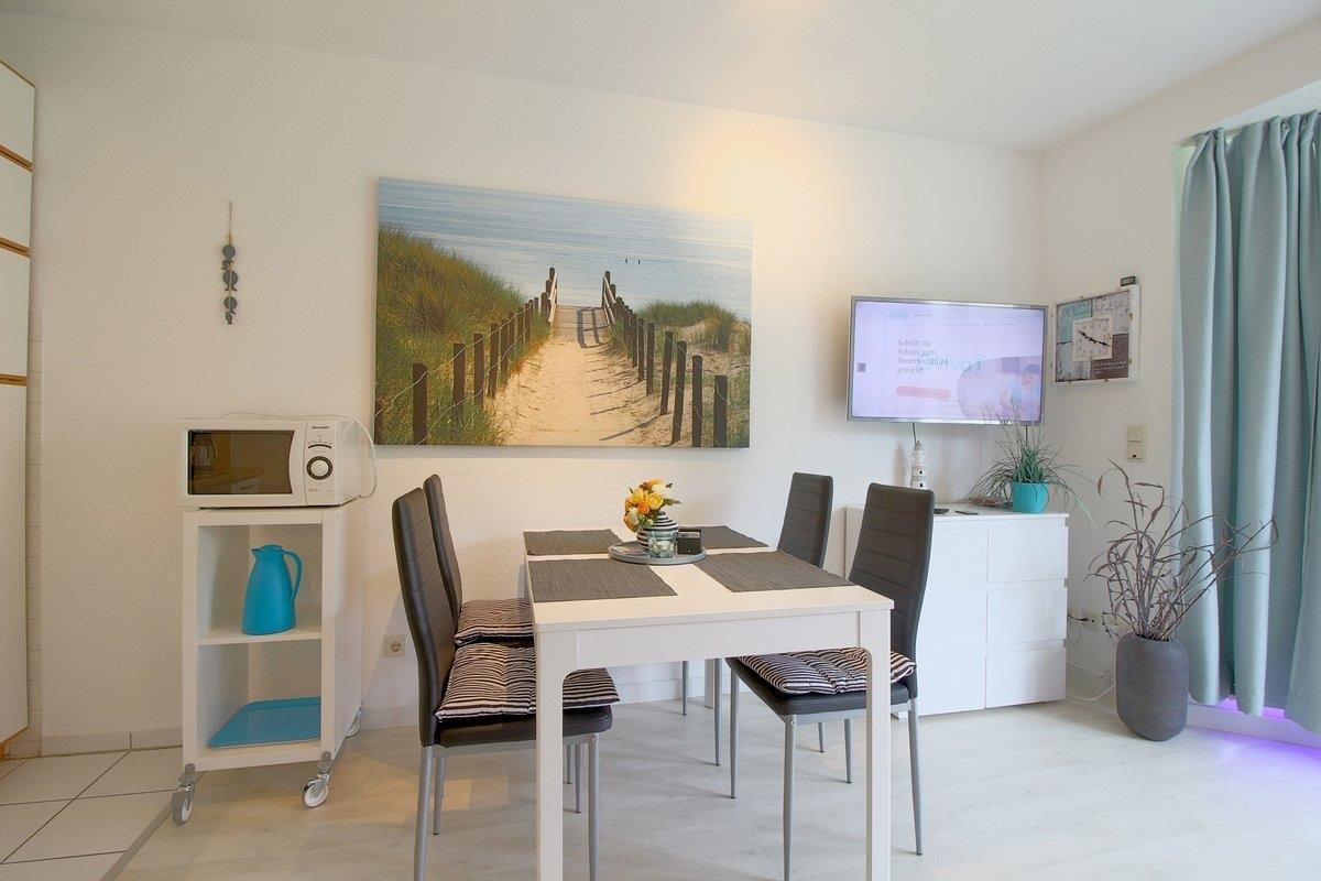 Die Küche ist gut eingerichtet, alles was der Hobbykoch braucht steht bereit. Von der Kaffeemaschine bis zum Toaster ist alles vorhanden. Das Wohnzimmer ist modern und bequem eingerichtet. Auch hier fehlt nichts! Fernseher und Radioanlage vorhanden. Die Ferienwohnung hat einen Süd-West-Balkon mit Tisch und Gartenmöbel. Kostenloses W-Lan ist selbstverständlich dabei.