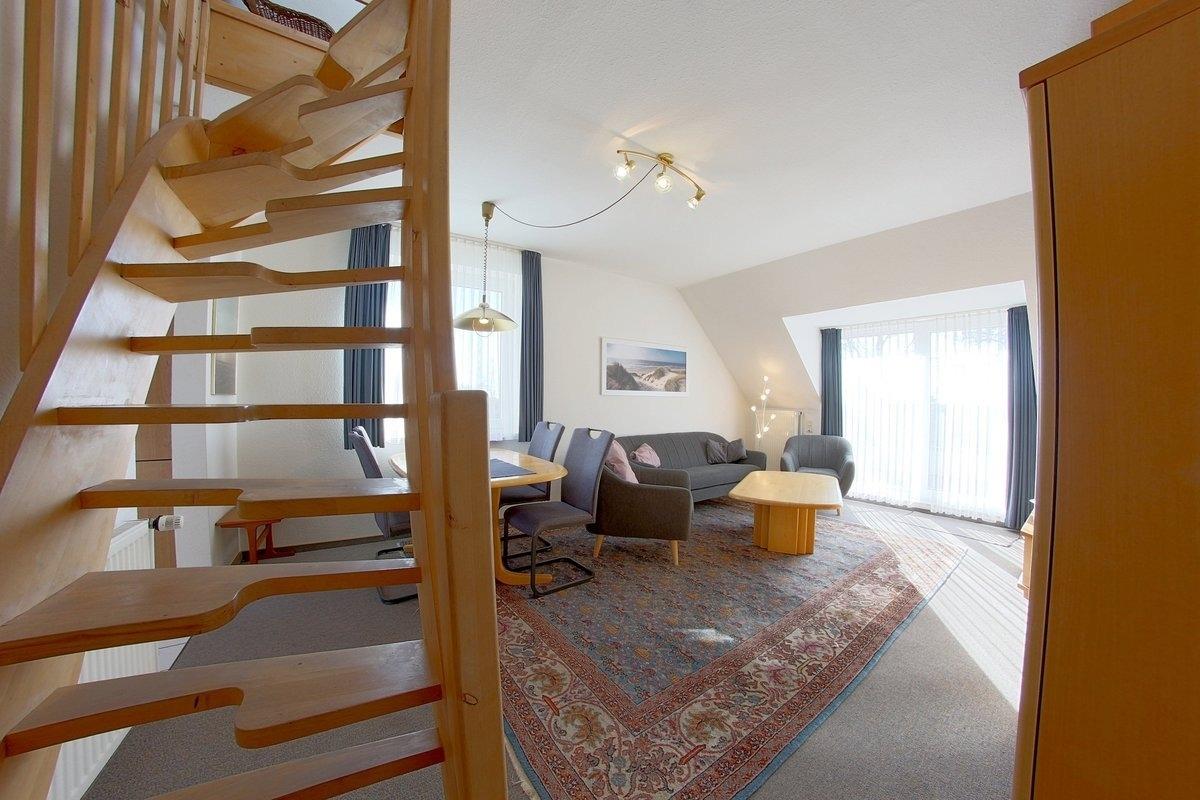 Ein heller Wohnraum mit Essplatz und Ausgang zum sonnigen Balkon, sowie eine Treppe zum 2. Schlafzimmer im Dachgeschoss für die Kinder sorgen für genügend Platz.