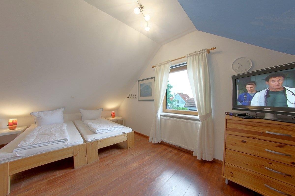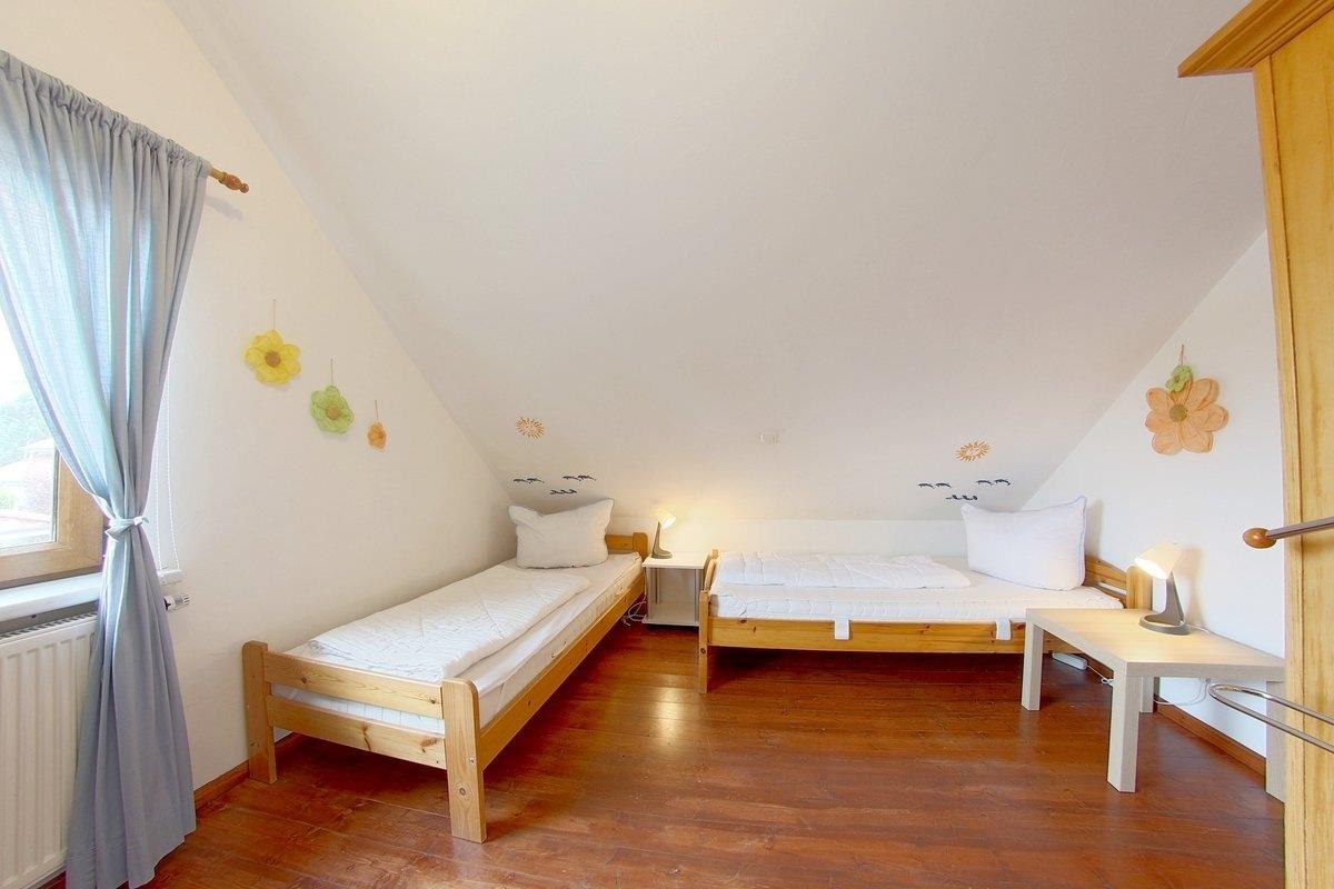 Im OG gibt es 2 weitere Schlafzimmer, eins mit Doppelbett und eins mit 2 aneinander gestellten Einzelbetten ( je 1,00 x 2,00 m ), Flachbildfernseher, Kinderbett und Verdunkelungsmöglichkeit. Ein weiteres Duschbad ist ebenfalls im OG.