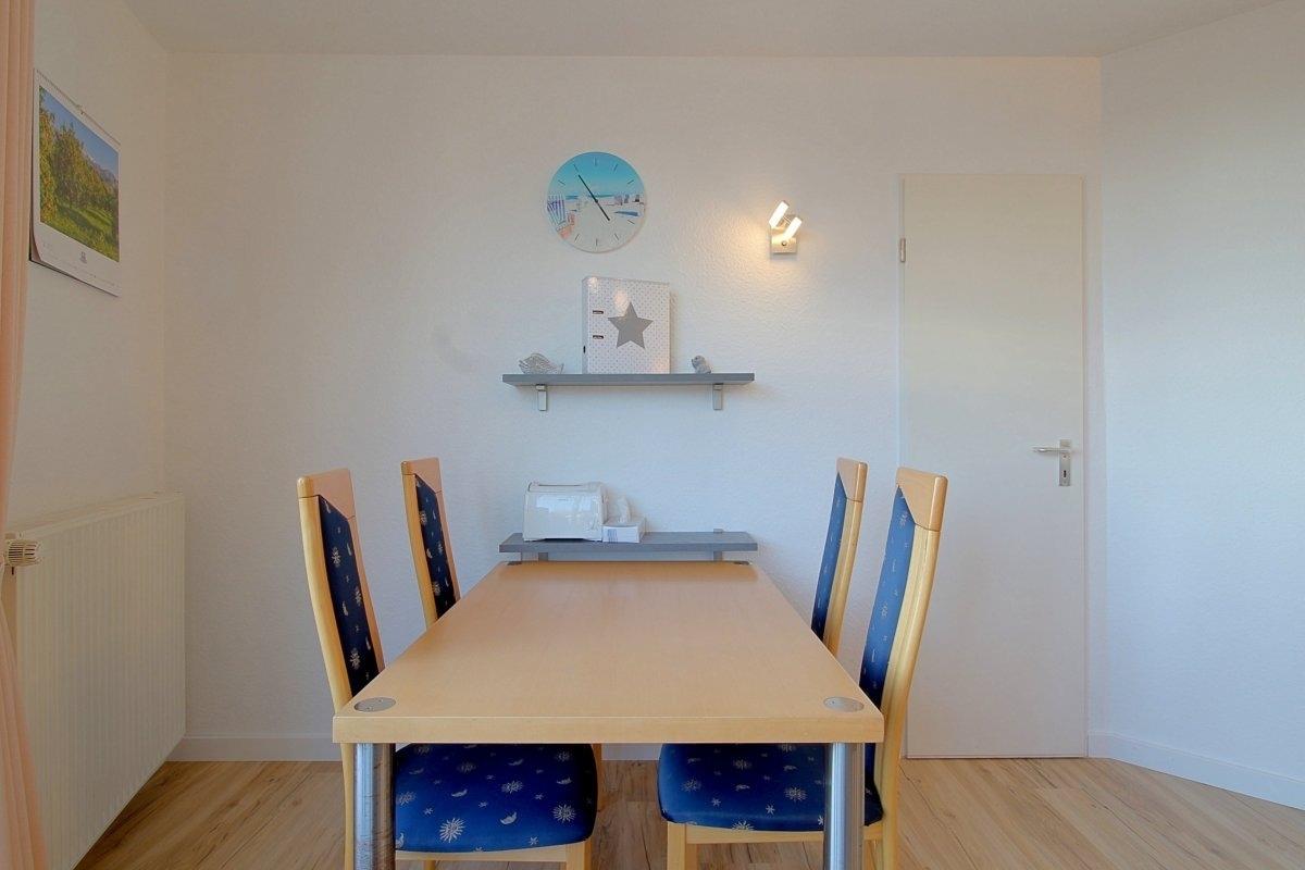 Sie verfügt über (Wohn-/Esszimmer, zwei separate Schlafzimmer sowie ein Bad mit Dusche und einen kleinen Abstellraum). Der großzügige Süd-/West-Balkon ist vom Wohn- und Schlafbereich begehbar. Von hier aus können Sie den Sonnenuntergang über dem Deich genießen.