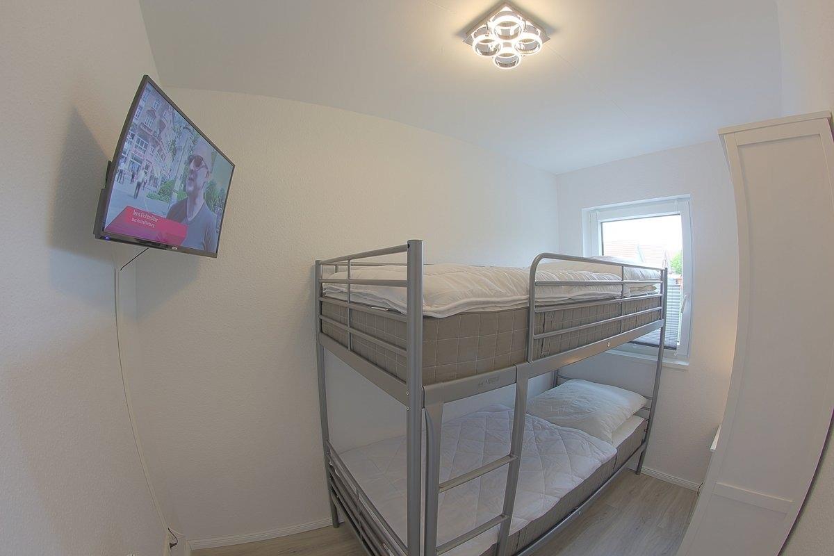 Im Obergeschoss befinden sich zwei Schlafzimmer, eins mit Doppelbett (1,60 x 2,00 m) und TV, sowie ein Schlafzimmer mit 2 Einzelbetten ( 0,90 x 2,00 m) und ebenfalls TV. Ein Kinderschlafzimmer mit Etagenbetten und ebenfalls TV steht im Erdgeschoss zur Verfügung.