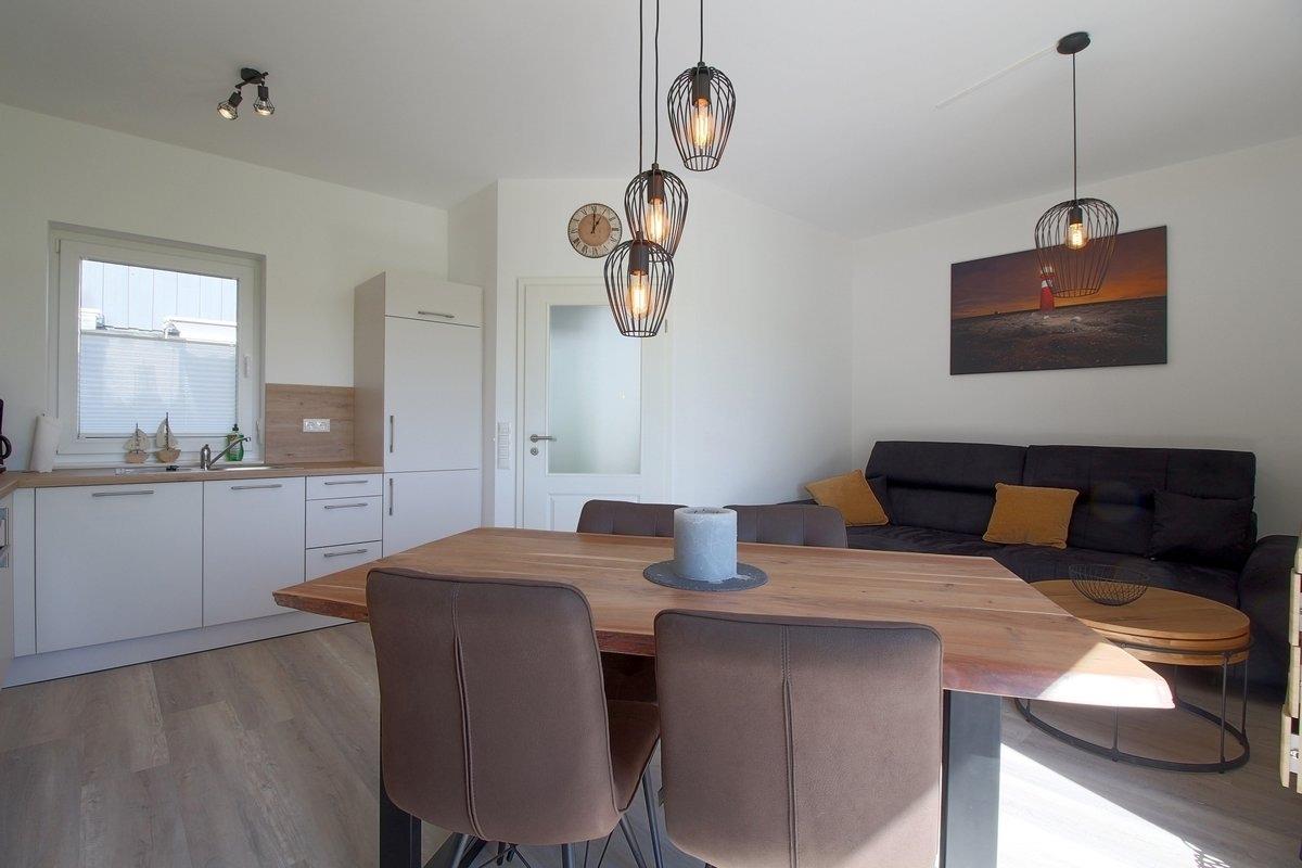 Der Mittelpunkt des im Juli 2023 fertiggestellten, modern gestalteten Hauses ist ein Wohn-Esszimmer mit integrierter moderner Einbauküche und Flat-TV.