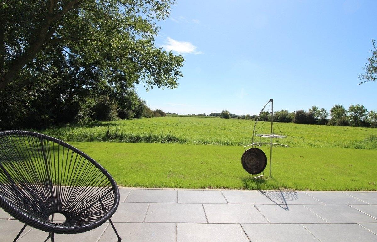 Jedes Zimmer hat einen direkten Zugang zu der großen Terrasse mit traumhaftem Blick über die Wiesen und Felder von Neufeld. Auf der sonnigen Terrasse können Sie sich auf einer der Liegen erholen oder es sich in geselliger Runde beim Grillen oder an der Feuerschale gutgehen lassen.