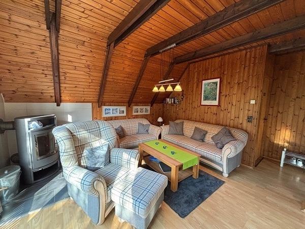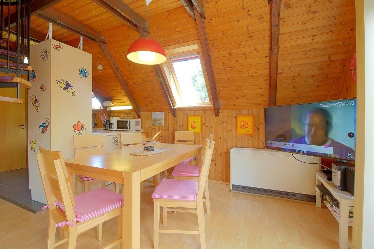 Im Erdgeschoss finden Sie den offen gestalteten Wohn- und Essbereich mit einer schicken Einbauküche, in der es an nichts fehlt. Highlight im Wohnbereich ist der gemütliche Kaminofen, der in der kühleren Jahreszeit ordentlich einheizt. Auf der sonnigen Terrasse können Sie in Ruhe ein Buch lesen, oder einfach nur die Sonne geniessen. Schnelles Internet mit Glasfaserkabel steht den Gästen kostenlos zur Verfügung.