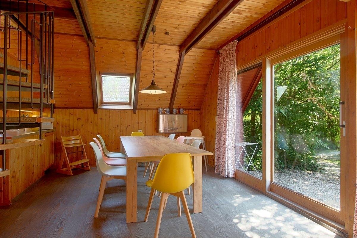 Im Erdgeschoss des Hauses befindet sich der offene Wohn-, Ess- und Küchenbereich, ein Schlafzimmer mit Doppelbett (1,60 x 2,00 m) durchgehende Matratze und ein einfaches Duschbad mit Fenster. Das Wohnzimmer verfügt über einen Kaminofen und FLAT-TV. Ab sofort auch kostenloses W-Lan verfügbar. Für die kleinen Gäste gibt es eine Kinderspielecke.