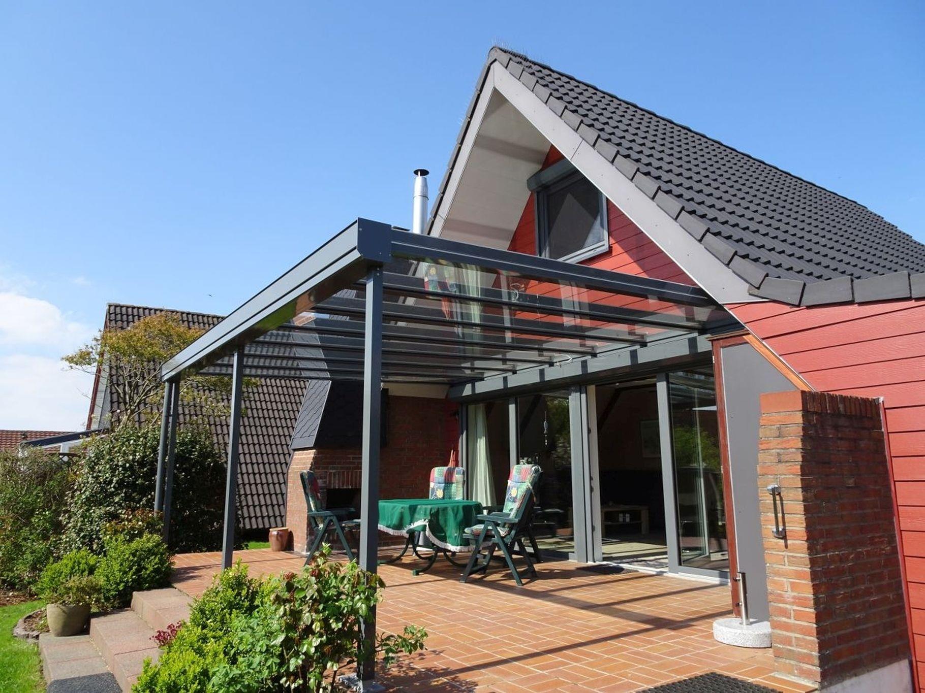 Überdachte Südterrasse mit Gartenmöbeln, Sonnenliegen, Holzkohlegrill und Außenkamin