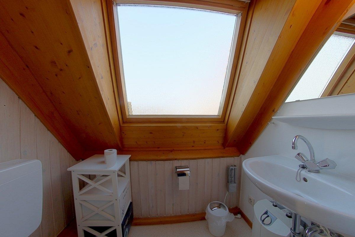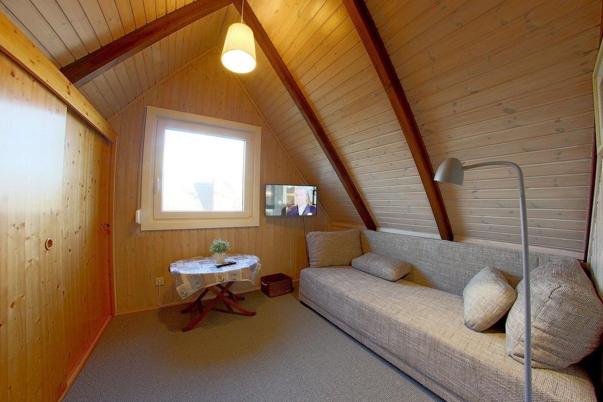 Im Obergeschoß befindet sich 1 Schlafraum mit 2 Einzelbetten 200 x 90cm, 1 Freizeit-/Ruhezimmer mit TV und Schlafcouch sowie ein zusätzliches WC.