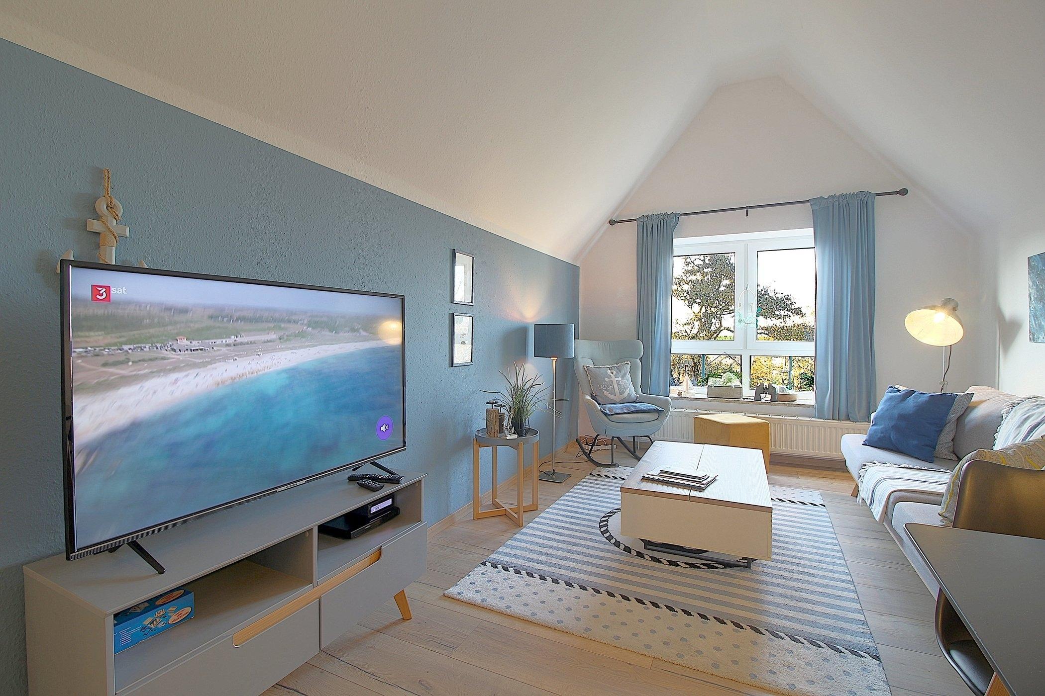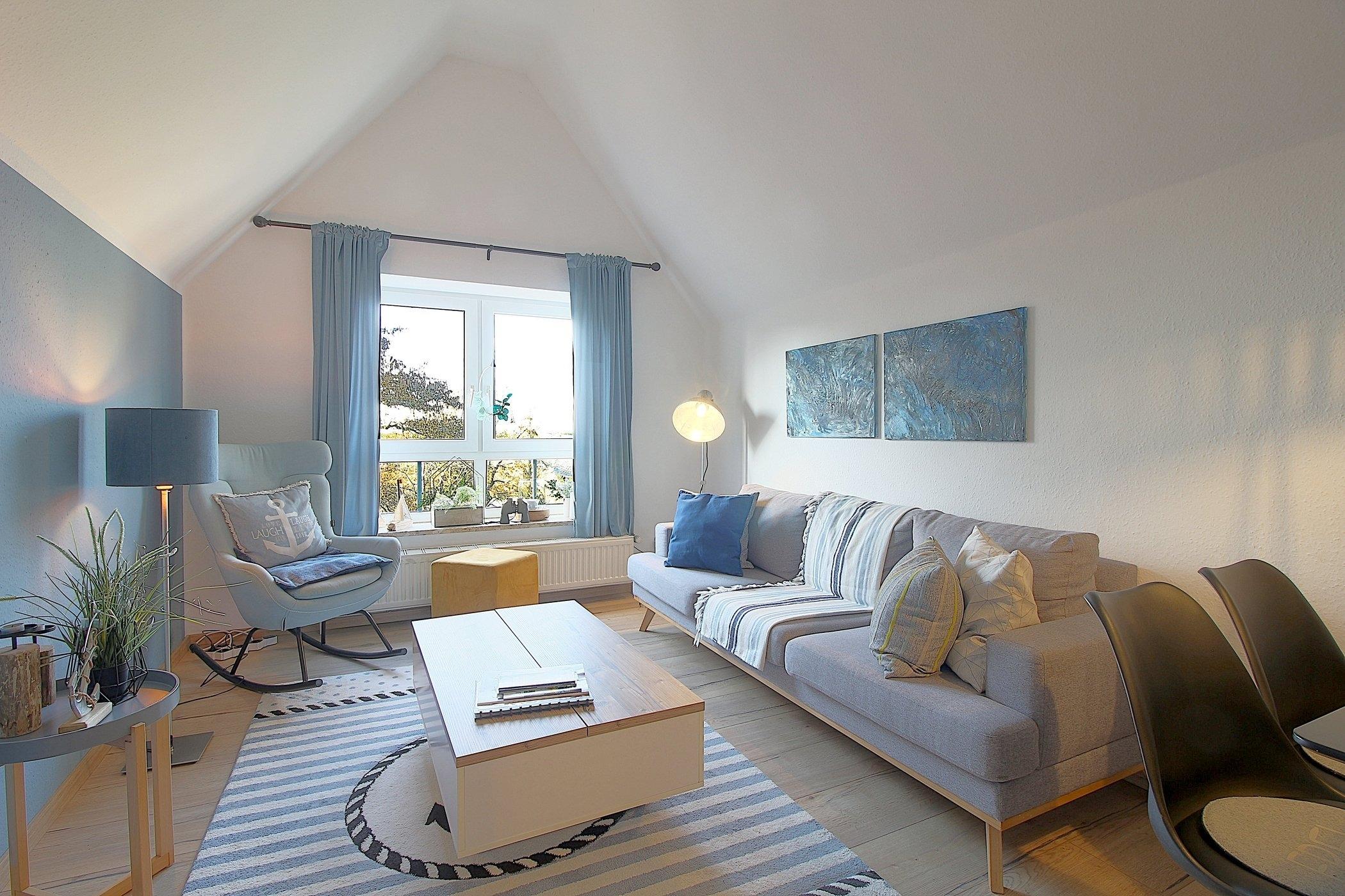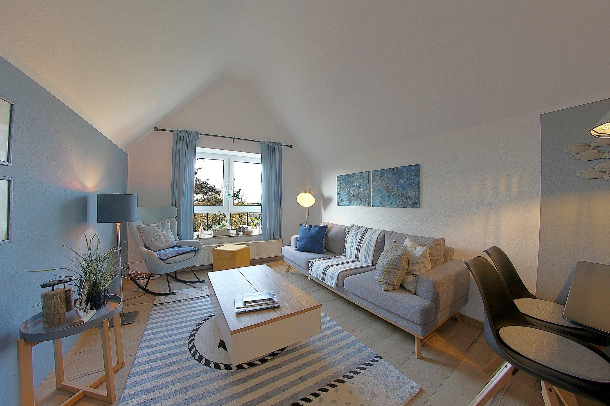 Im maritimen Look präsentiert sich diese gemütliche FeWo mit[nbsp] einem gemütlicher Wohn- und Essbereich, einer kleinen Arbeitsküche, Duschbad und 2 Schlafzimmern. Ein Schlafzimmer mit Doppelbett und ein Schlafzimmer mit 2 Einzelbetten sorgen für entspannte Nächte.