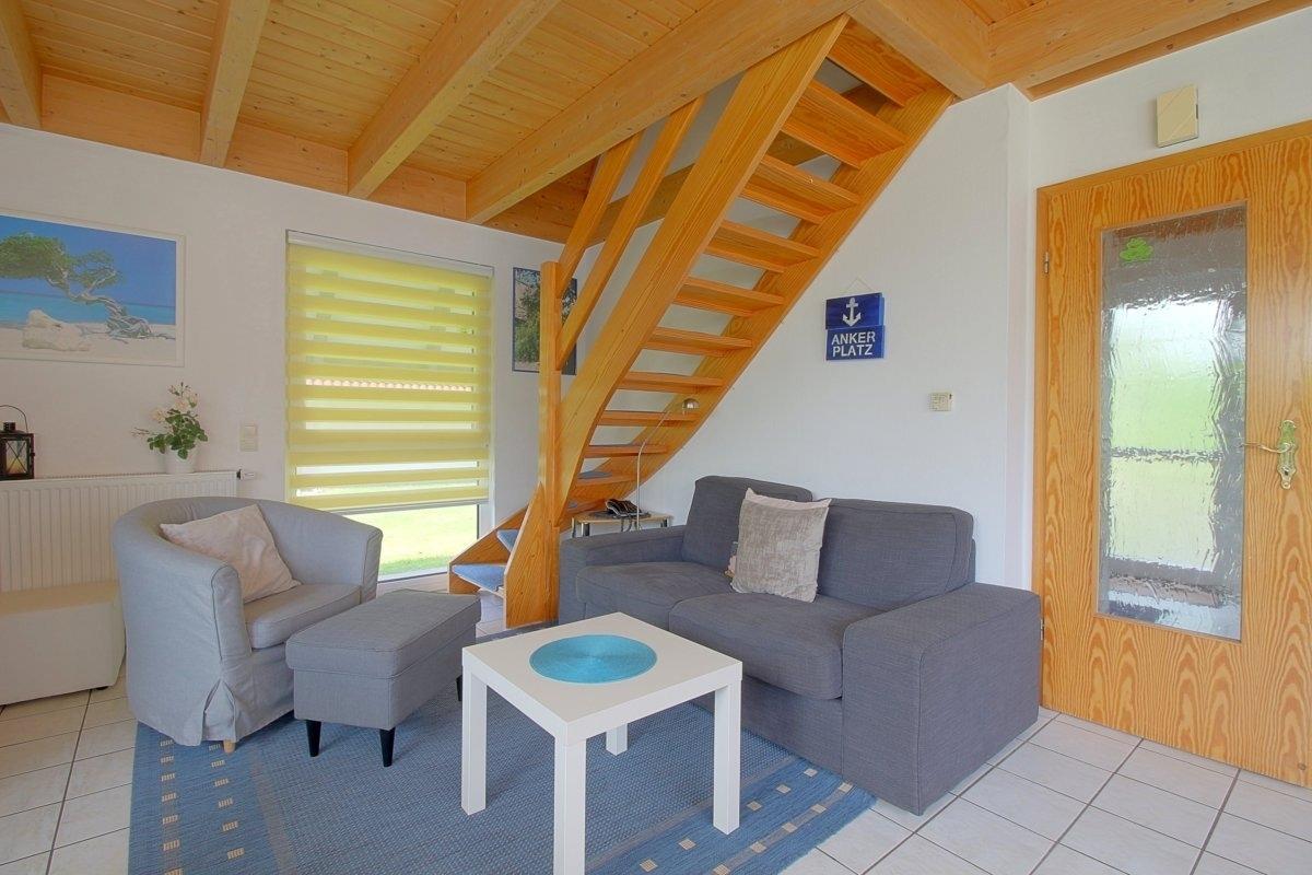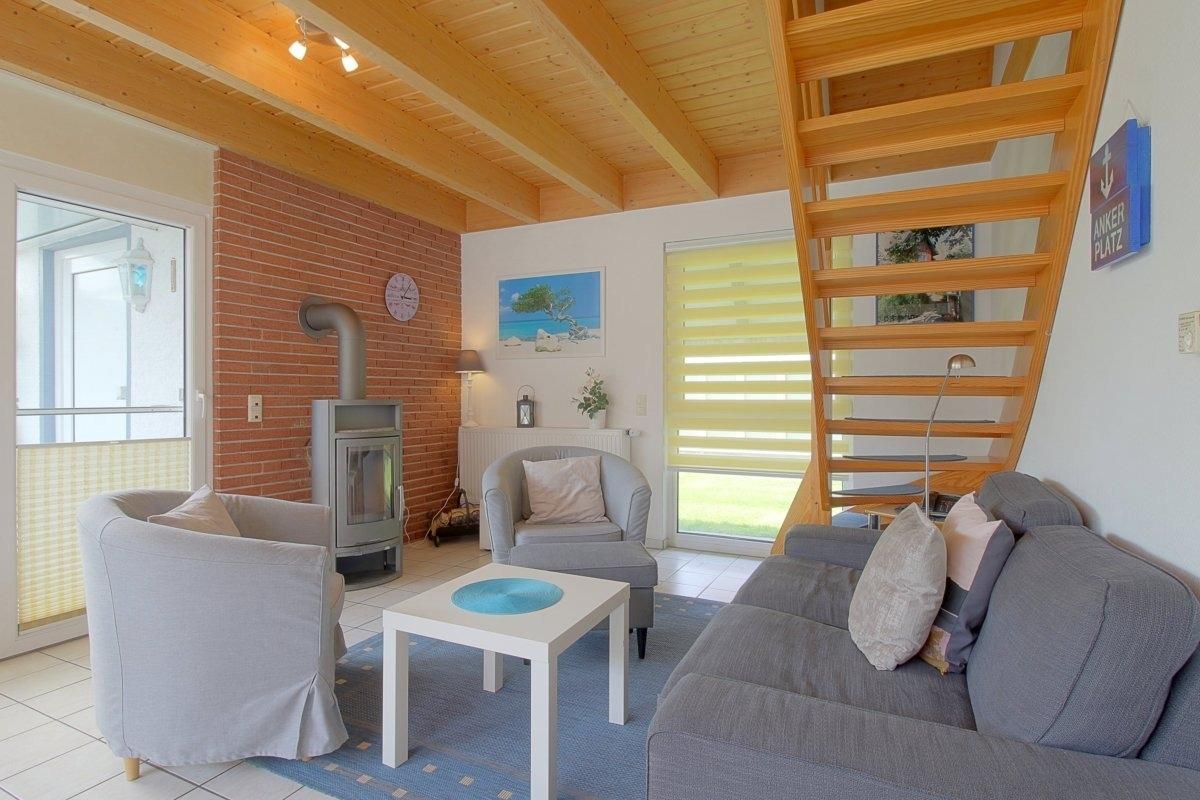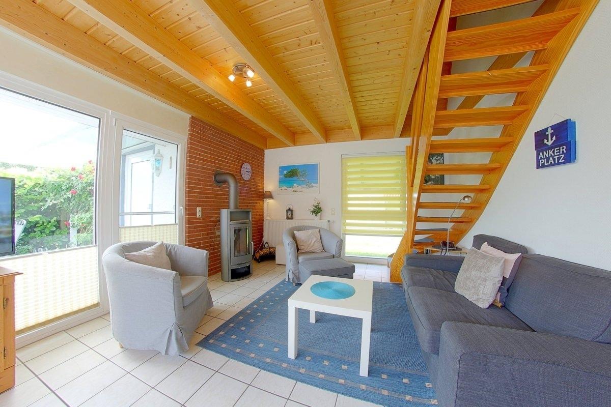 Im Erdgeschoss befinden sich der große Wohn- und Essbereich mit Kaminofen, das geräumige Bad mit Dusche/WC und Fön und ein Abstellraum. Im Obergeschoss sind 2 Schlafräume (1 Schlafraum mit Doppelbett und 1 Schlafraum mit drei Einzelbetten). Geräumige, teilüberdachte Terrasse mit großem Sonnenschirm, Gartenmöbeln und Strandkorb.