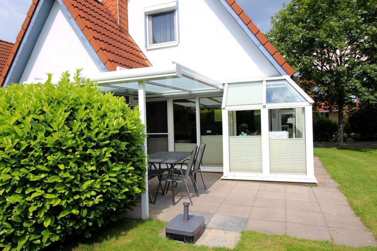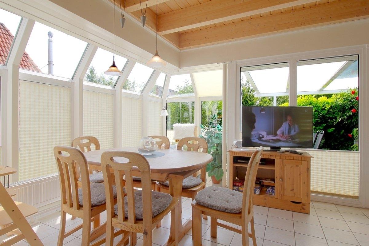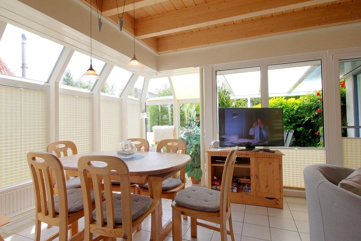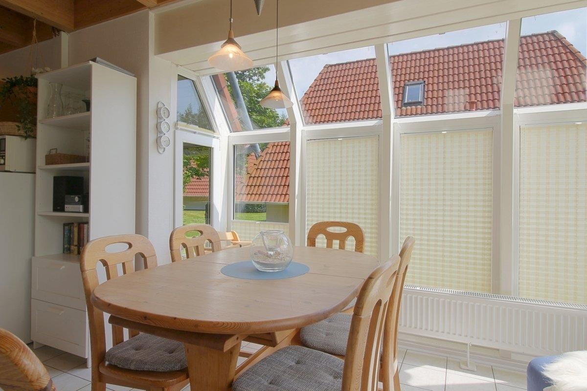 Im Erdgeschoss befinden sich der große Wohn- und Essbereich mit Kaminofen, das geräumige Bad mit Dusche/WC und Fön und ein Abstellraum. Im Obergeschoss sind 2 Schlafräume (1 Schlafraum mit Doppelbett und 1 Schlafraum mit drei Einzelbetten). Geräumige, teilüberdachte Terrasse mit großem Sonnenschirm, Gartenmöbeln und Strandkorb.