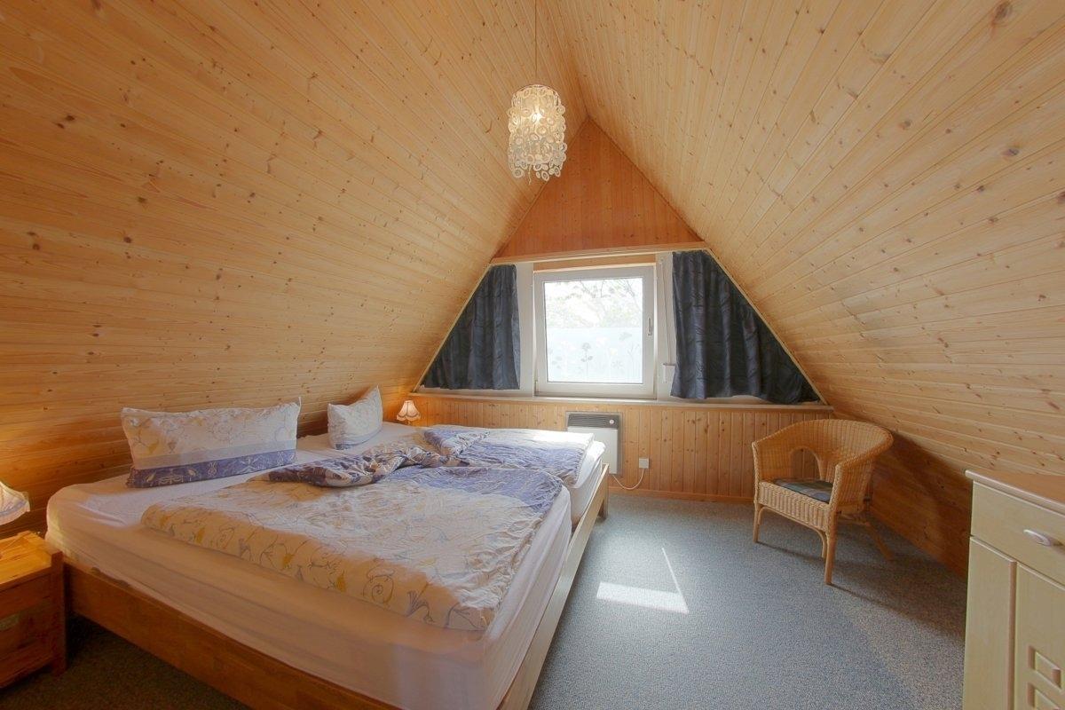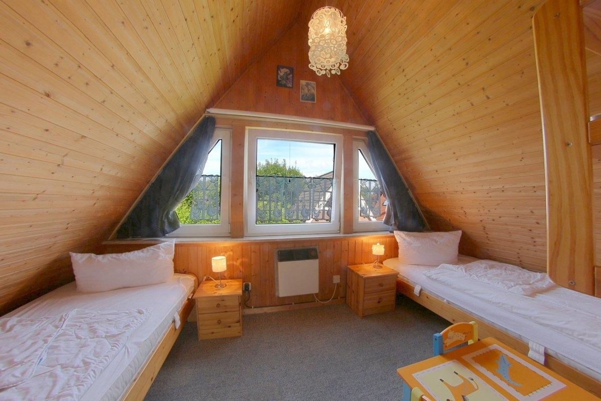 Im Obergeschoss liegen die beiden Schlafzimmer, eins mit Doppelbett (2x2 m), das andere mit 2 Einzelbetten und TV.