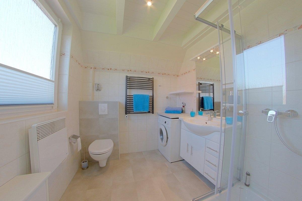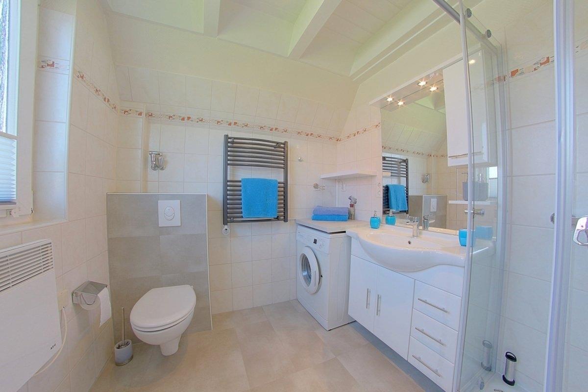 Ebenfalls im Erdgeschoss befindet sich das moderne Duschbad mit Waschmaschine und Fenster. Das Erdgeschoss ist komplett gefliest.