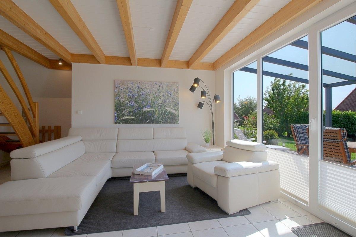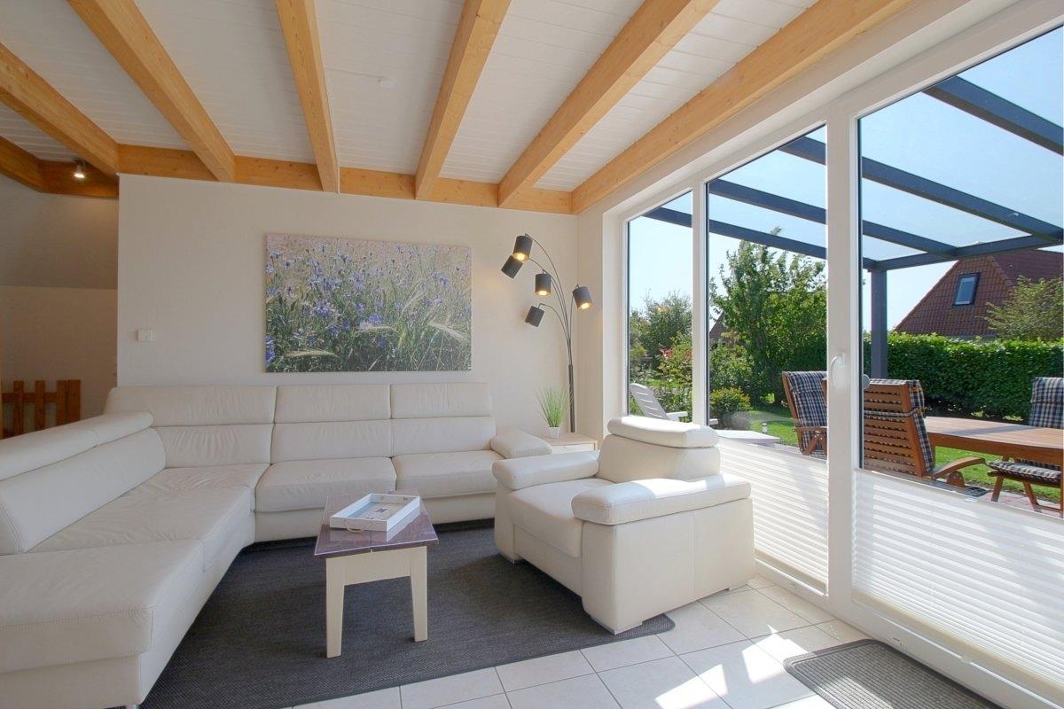 Vom Wohnraum aus gelangen Sie auf die überdachte Terrasse, so dass Sie wenn es einmal tröpfeln sollte immer noch draussen bleiben können.