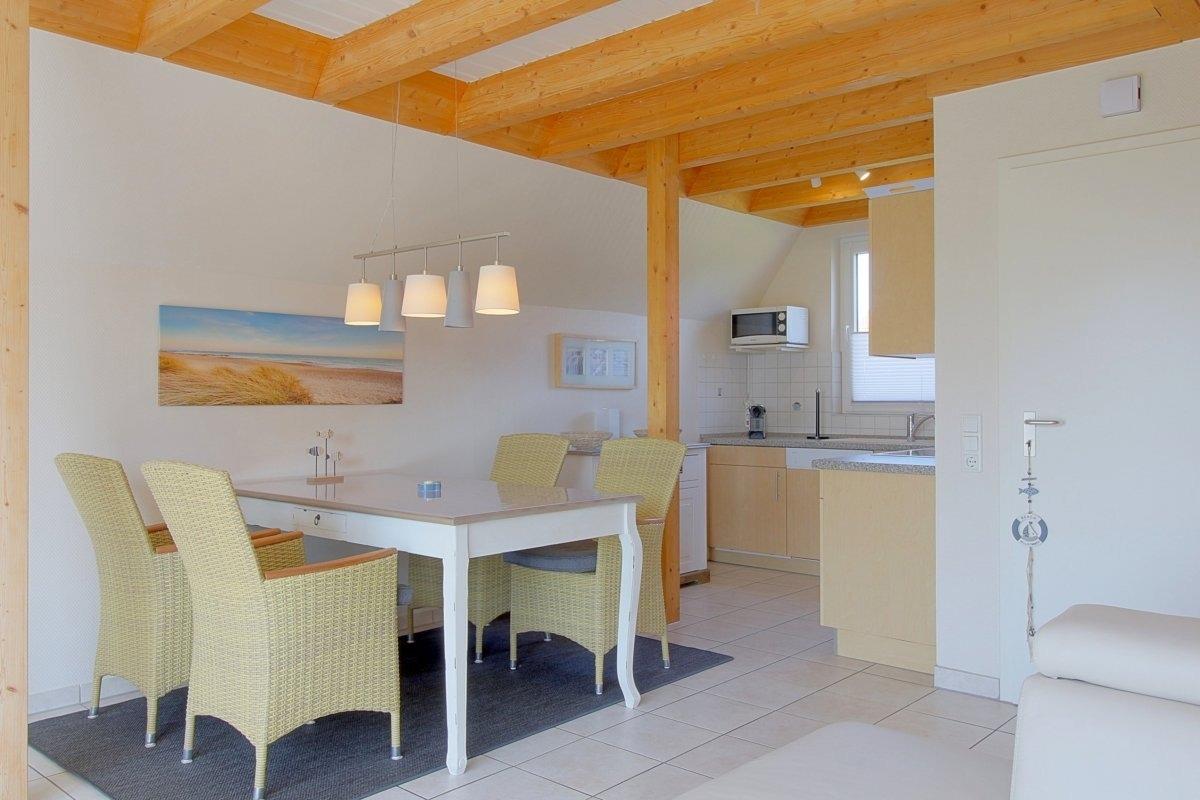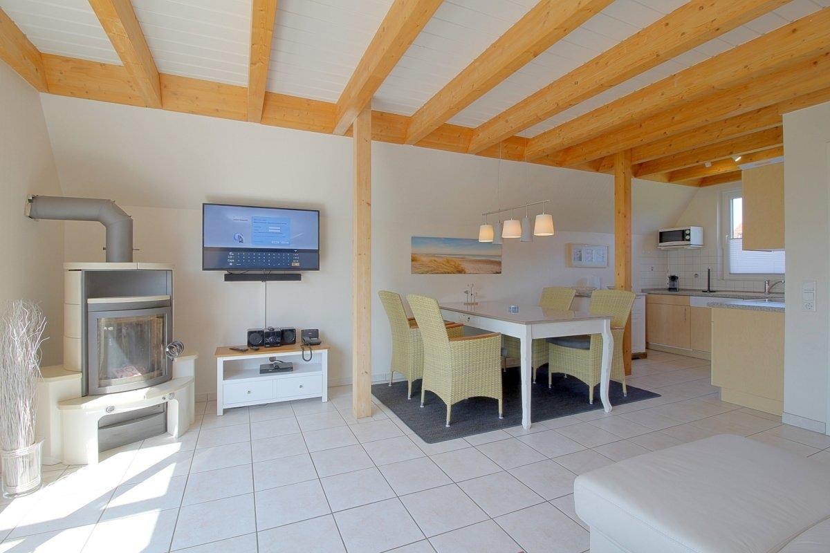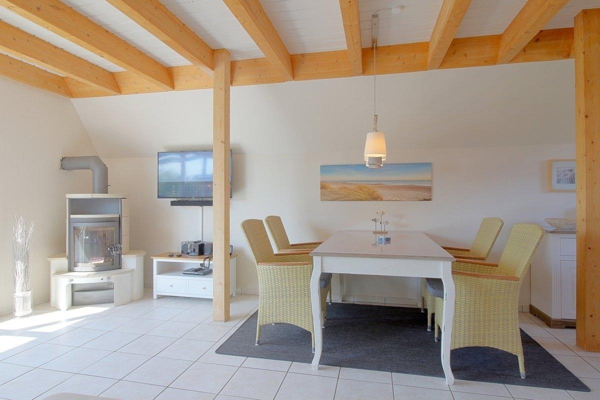 In der großzügigen Sitzgarnitur können Sie dem Kaminfeuer zuschauen, oder einfach nur fernsehen, oder ein gutes Buch lesen. Der Essplatz bietet Platz für 4 Personen.