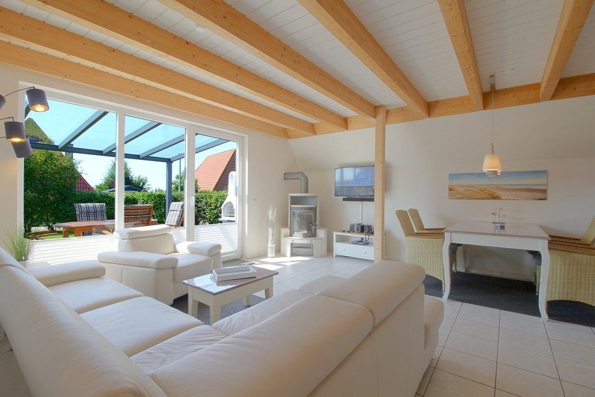 Gemütliche Ferienwohnung mit Kamin, überdachter Terrasse und Garten in Dorum-Neufeld, ideal für Familien und Haustiere.