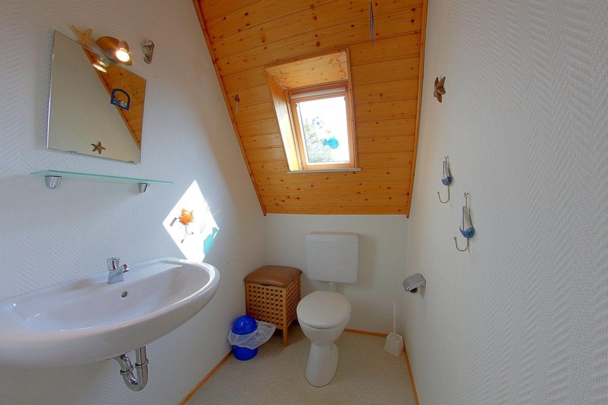 Das Bad im Erdgeschoss ist neben einem Waschbecken und einer Toilette auch mit einer Dusche und einer Waschmaschine ausgestattet.