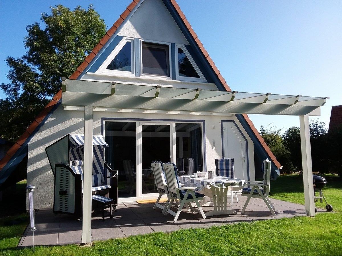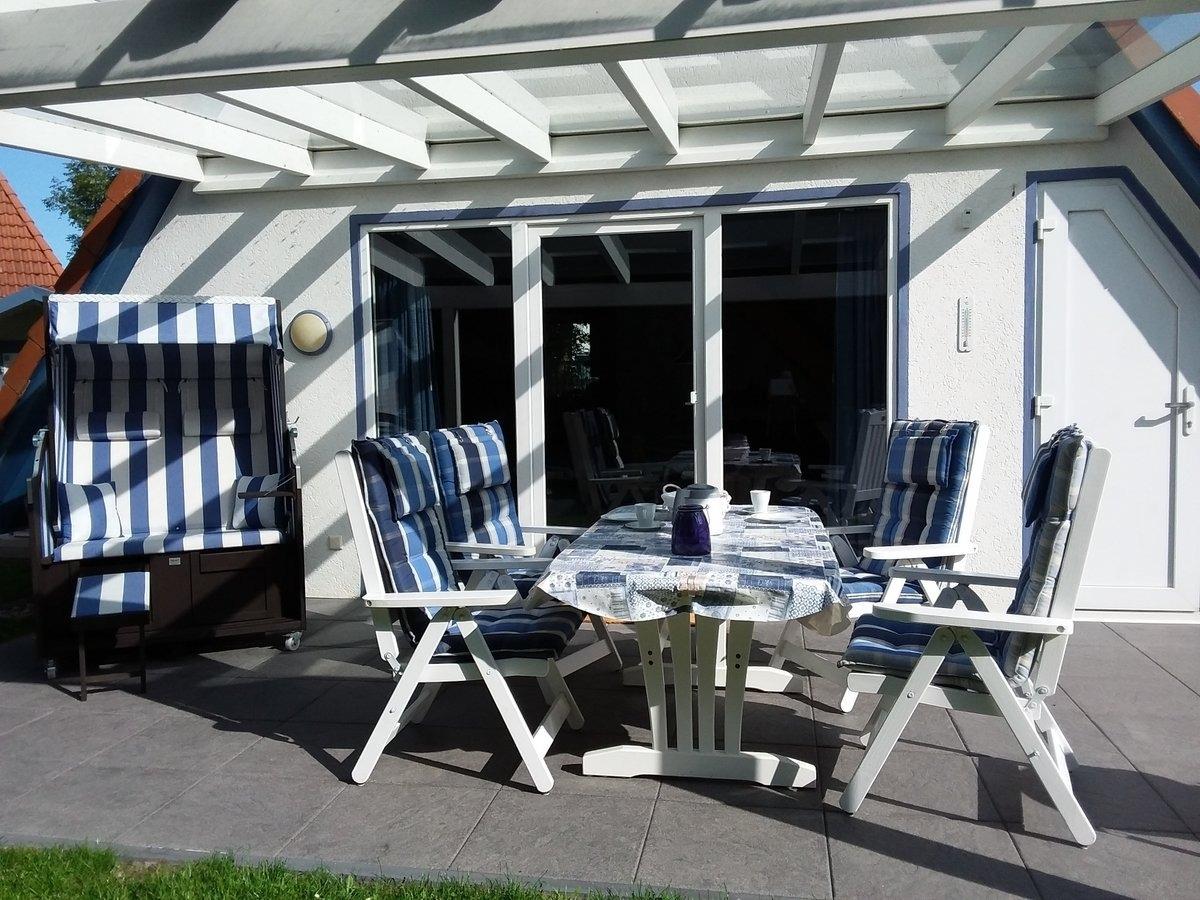 Die überdachte, sonnige Terrasse mit Strandkorb, Gartenmöbeln und Sonnenliegen bietet Platz für die ganze Familie. Ein PKW-Stellplatz ist in der Nähe vorhanden.