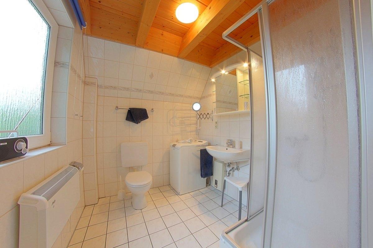Das helle Duschbad mit Fenster mit Insektenschutz und Waschmaschine befindet sich im Erdgeschoss.