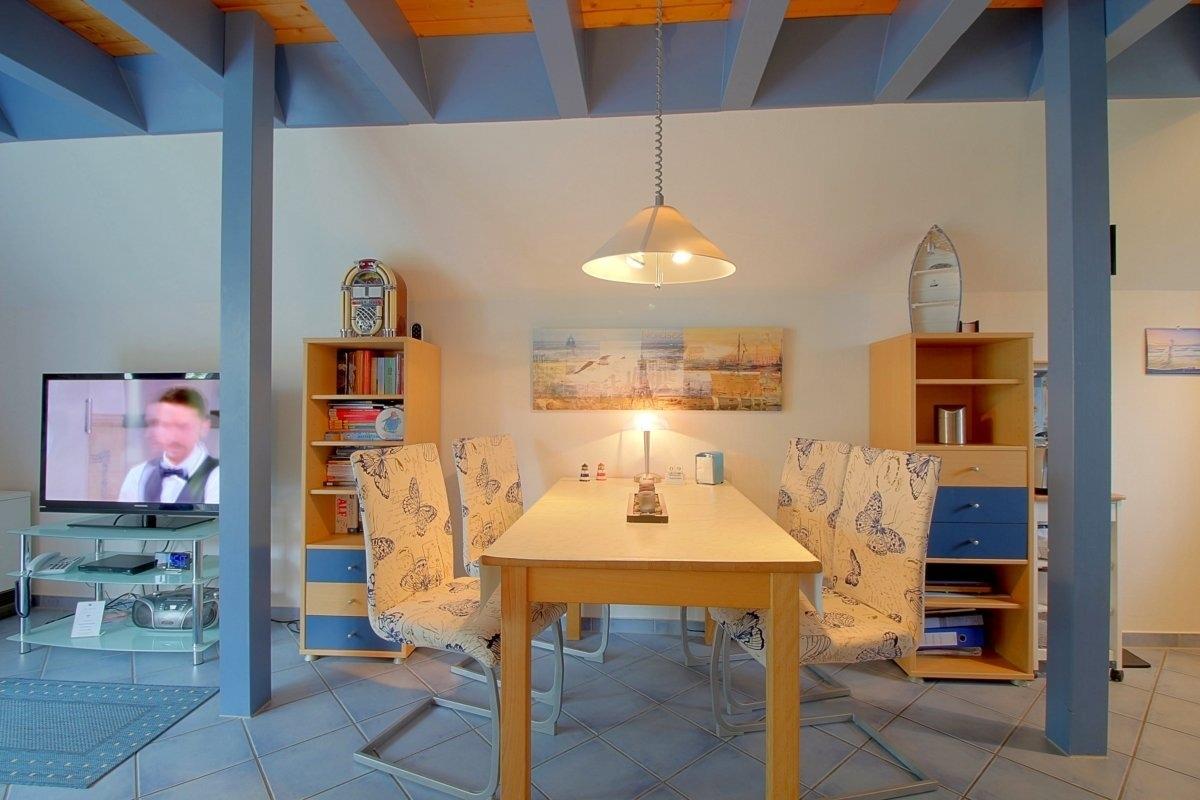 Friesisch eingerichtetes Haus für den Nordseeurlaub. Im Erdgeschoss gibt es einen offenen Wohnbereich mit Flat-TV, Essplatz und Küche mit komplett ausgestatteter Einbauküche mit Geschirrspüler. Vom Wohnraum aus geht es direkt auf die überdachte, sonnige Terrasse.