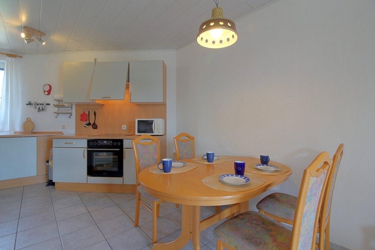 Die offene Küche mit E-Herd mit Backofen, Kühlschrank mit Gefrierfach, Kaffeemaschine, Toaster, Mikrowelle, Geschirrspüler, Waschmaschine und komplettem Geschirr lädt zum kochen ein.