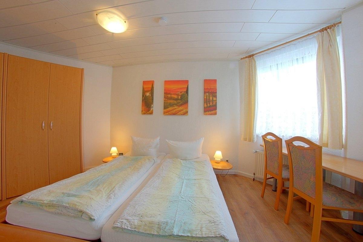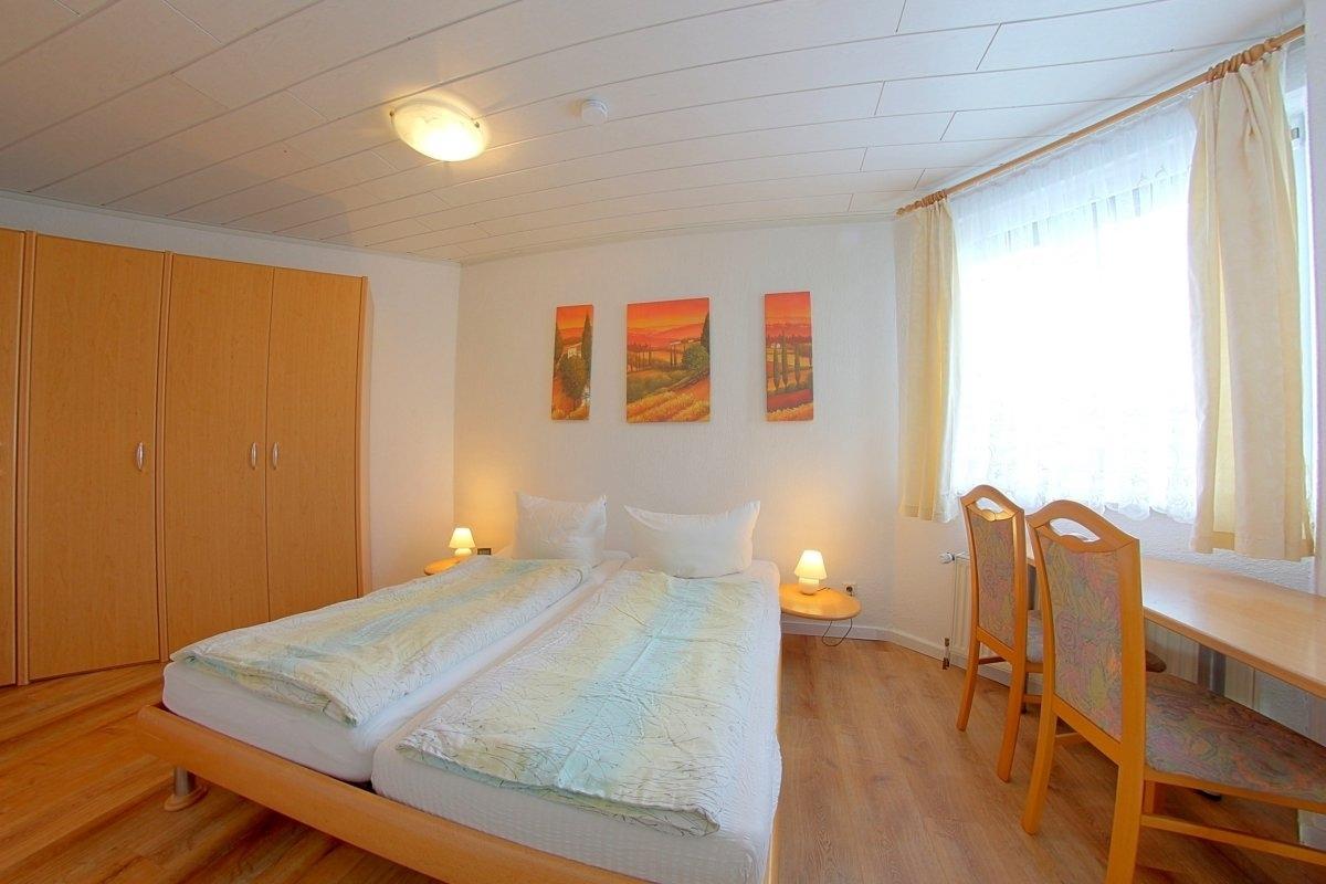 Ein Schlafzimmer mit Doppelbett und geräumigem Kleiderschrank, sowie ein Duschbad mit WC ebenfalls im Erdgeschoss.