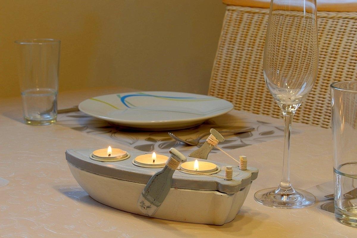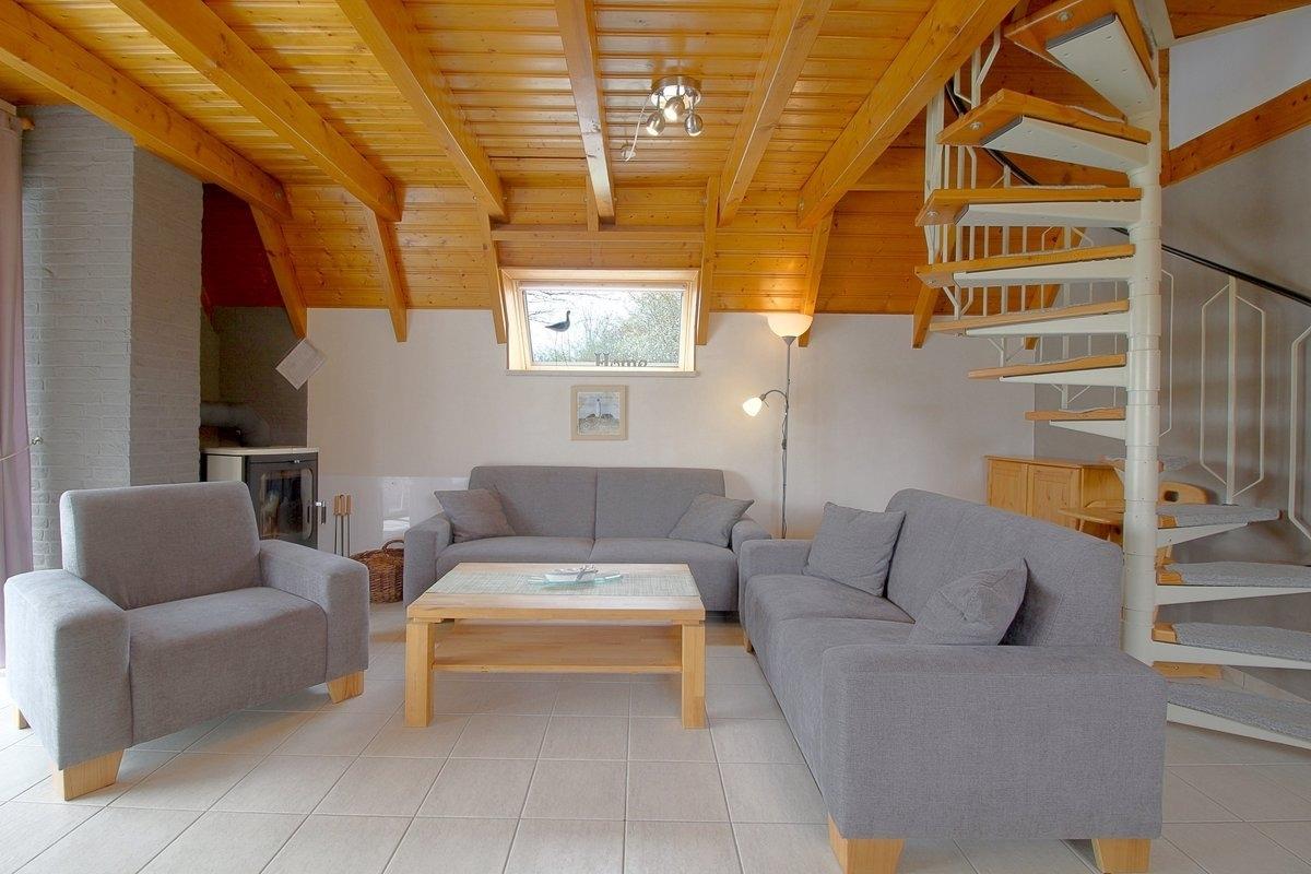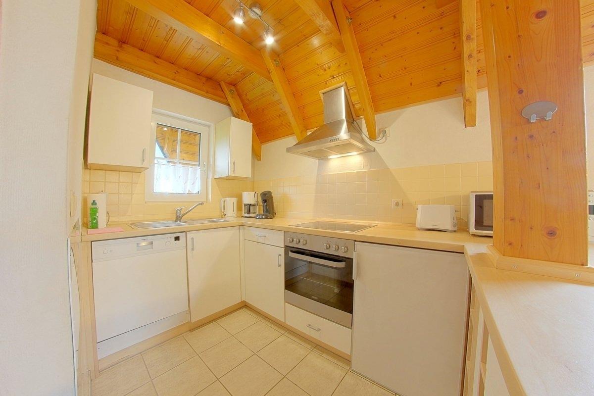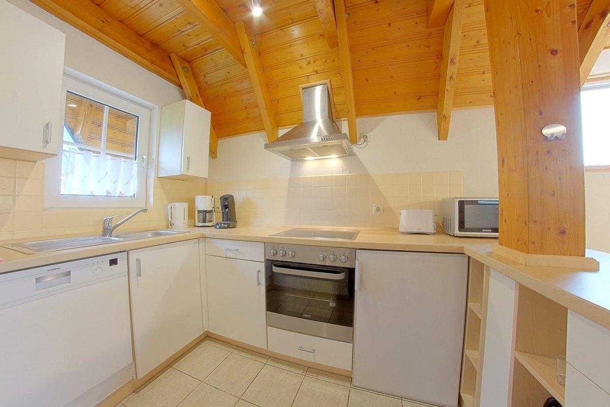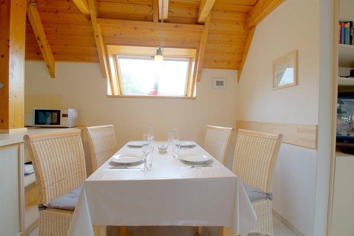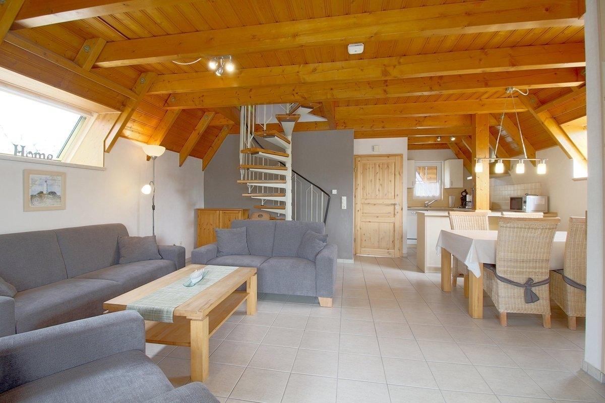 Im Erdgeschoss liegt der großzügige Wohn- Essbereich. Dem Gast steht eine voll ausgestattete Küche zur Verfügung. Sie beinhaltet eine Spülmaschine, ein Herd mit Backofen, einen Kühlschrank mit Gefrierfach, Toaster, Wasserkocher, Mikrowelle und Kaffeemaschine. Töpfe, Besteck und Geschirr sind auch vorhanden.