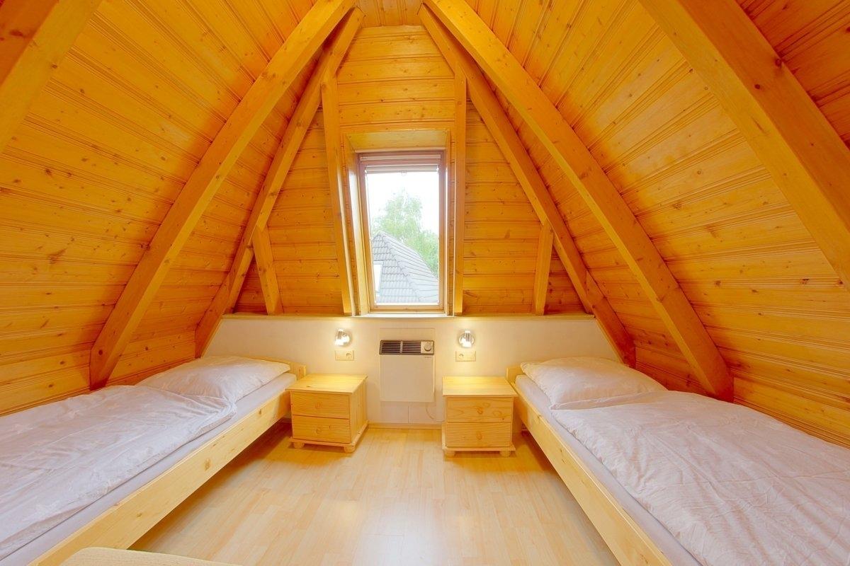 Im Obergeschoss befinden sich zwei getrennte Schlafräume für vier Personen. Elternschlafzimmer mit einem Doppelbett und Kinderzimmer mit 2 Einzelbetten. Ein Kleiderschrank ist im Flur eingebaut. Die Schlafzimmer verfügen über Verdunkelungsmöglichkeiten.