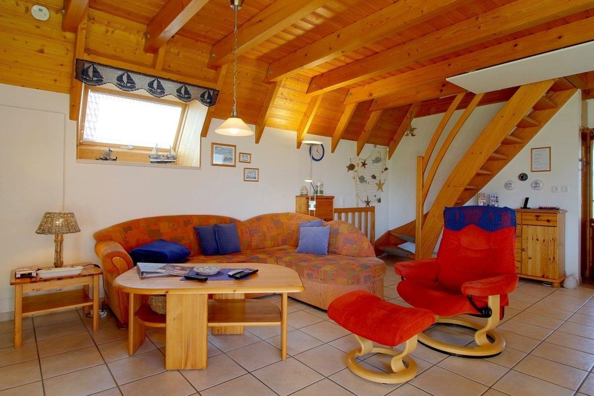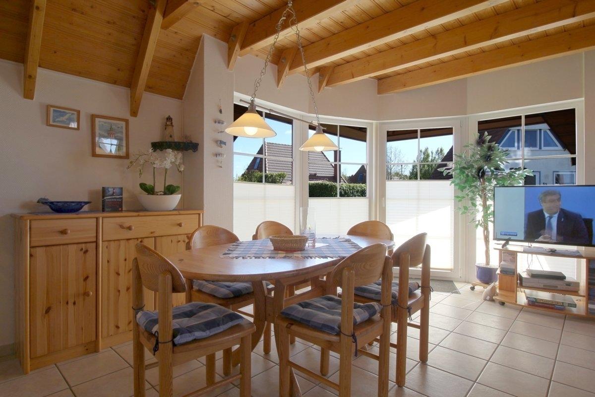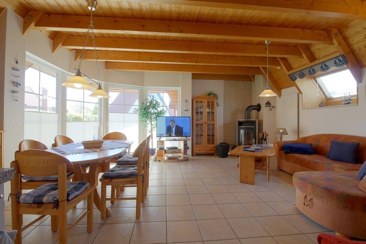 Im familienfreundlich gestalteten, im Erdgeschoss komplett gefliesten Haus, gibt es ein offenes Wohn-/Esszimmer, welches standardmäßig mit Fernseher inkl. Kabel- und Skyanschluss ausgestattet ist., Der Kaminofen für die kältere Jahreszeit bietet besondere Wohlfühlatmosphäre. Einbauküche mit Geschirrspüler und Mikrowelle. Vom Wohnraum aus geht es direkt auf die Terrasse mit Gartenmöbeln.
