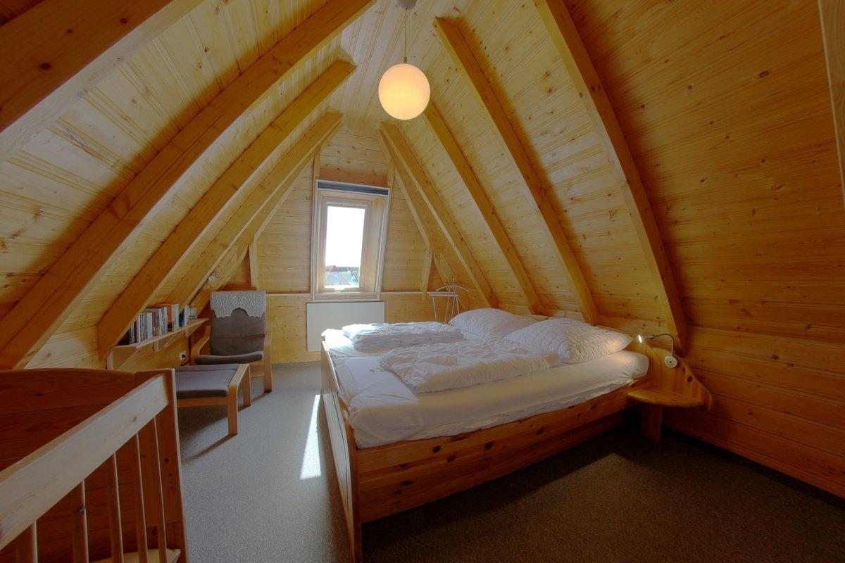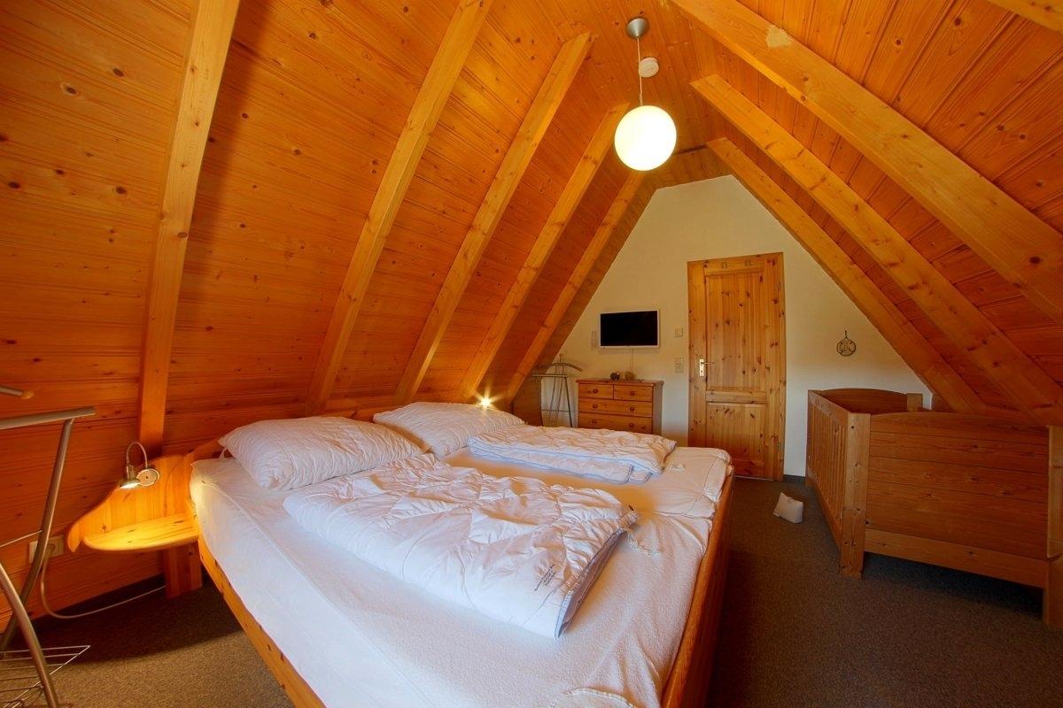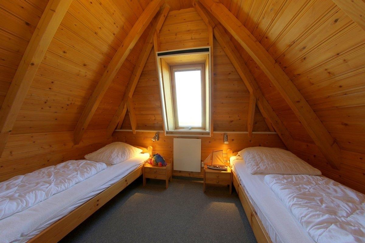 Im Obergeschoss befinden sich ein Schlafzimmer mit Doppelbett, Babybett und TV, sowie ein Schlafzimmer mit zwei Einzelbetten.