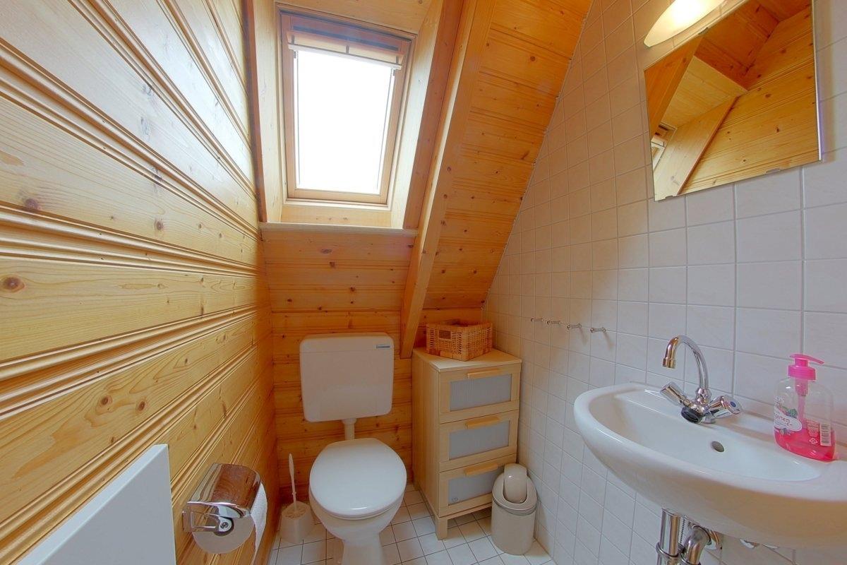 Im Badezimmer mit Dusche und WC befindet sich auch die Waschmaschine. Ein zusätzliches WC im Obergeschoß vervollständigt die sanitäre Ausstattung.