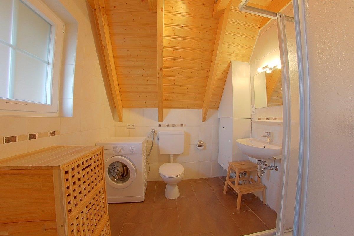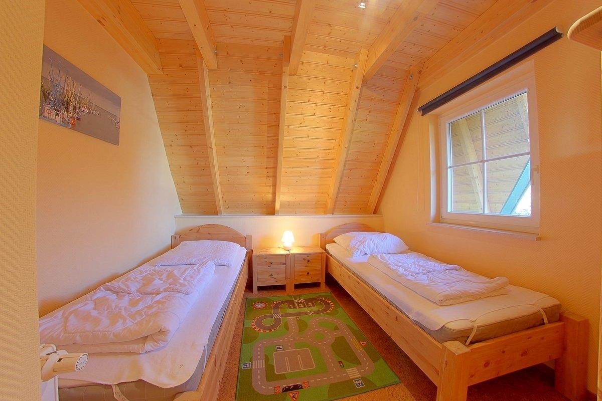 Im Erdgeschoß befindet sich ein Schlafzimmer mit zwei Einzelbetten und TV, sowie ein helles, modernes Duschbad.