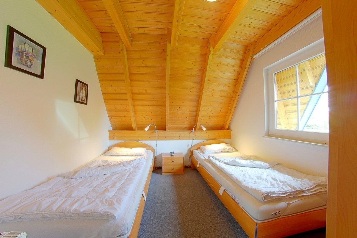 Im Obergeschoss gibt es ein Elternschlafzimmer mit Doppelbett und TV, sowie ein weiters Schlafzimmer mit 2 Einzelbetten. Für die lütten Gäste stehen Reisebett und Hochstuhl bereit.