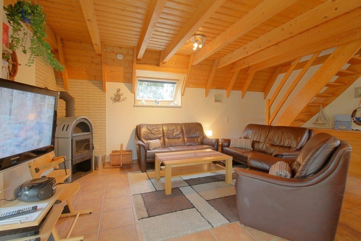 Zum Wohnbereich gehören eine behagliche Ledergarnitur, ein Kaminofen, natürlich Farb-TV (Flatscreen) mit SKY-Empfang (Sport, Spielfilme, Disney), ein DVD-Player und eine Mini-Stereoanlage.