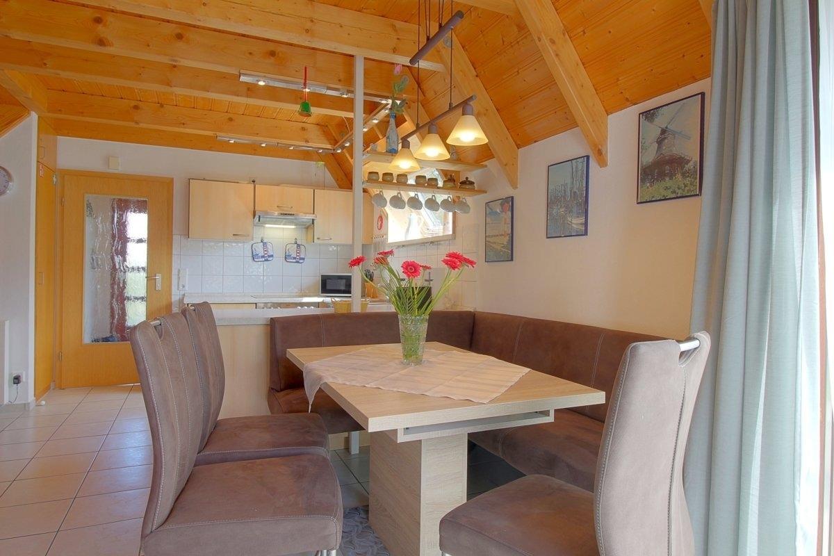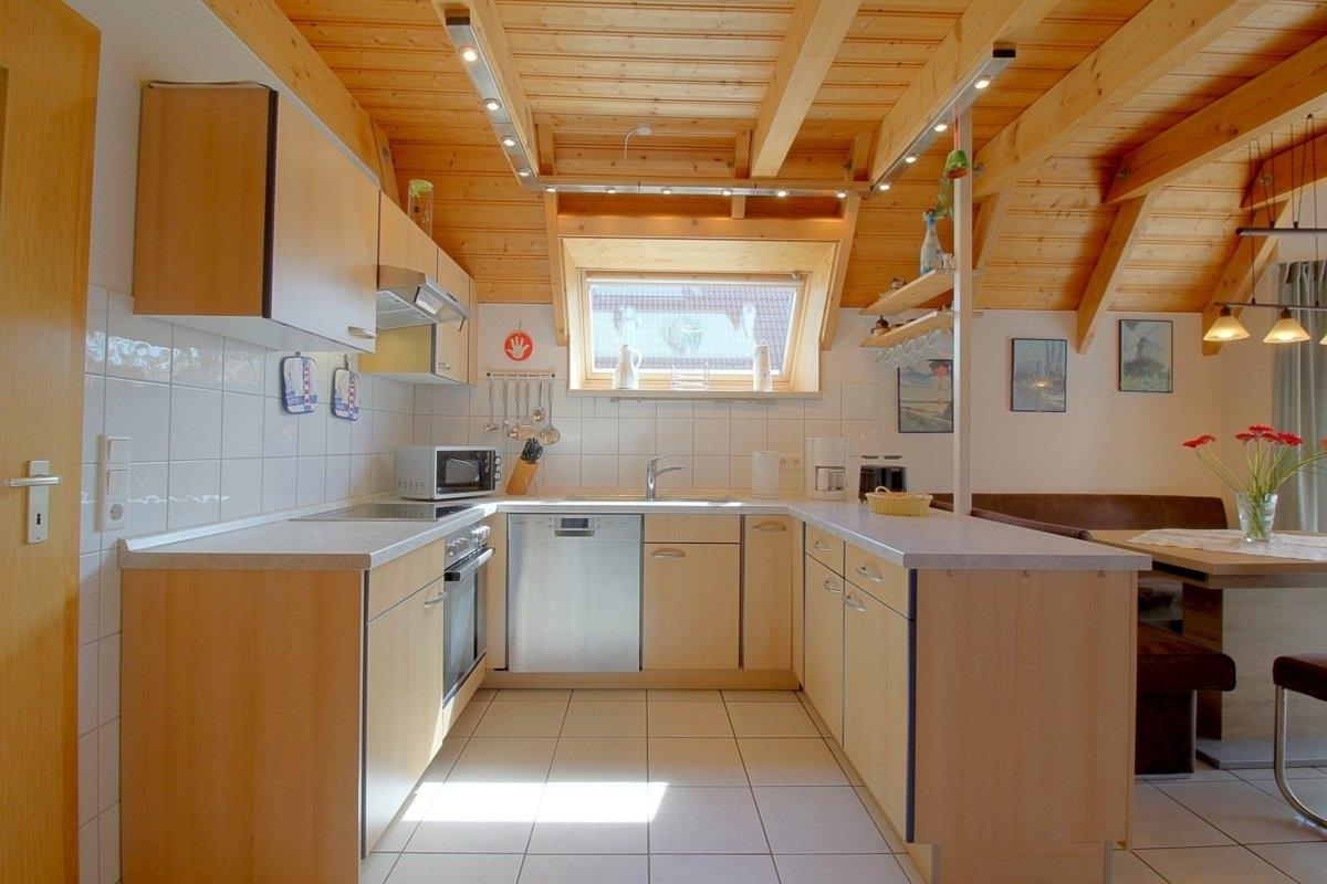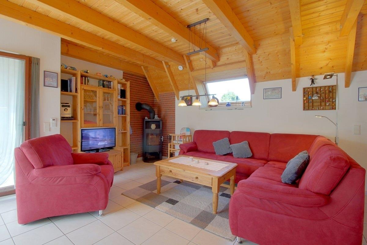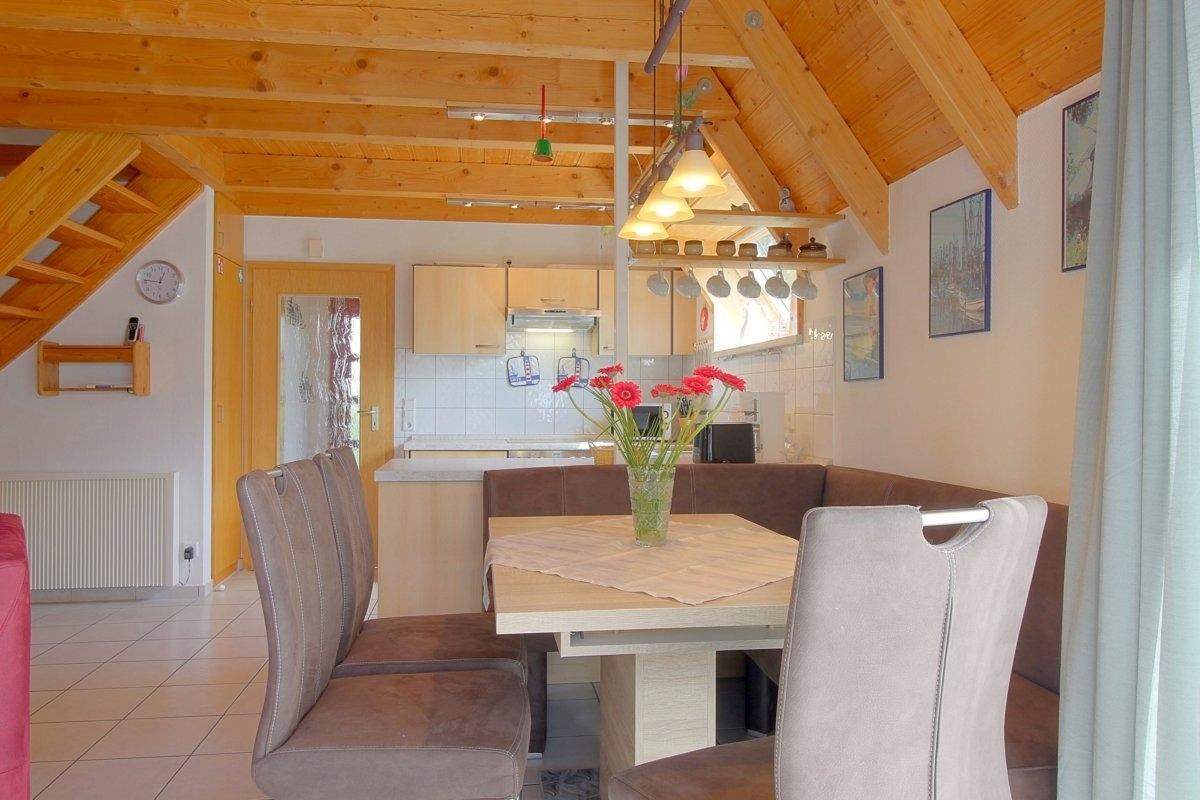 Im gefliesten Wohnbereich gibt es einen offenen Wohnbereich mit Kamin und großem großen Flat-TV, Essplatz und Küche mit komplett ausgestatteter moderner Einbauküche. Von hier aus geht es auf die Terrasse mit Abstellraum.