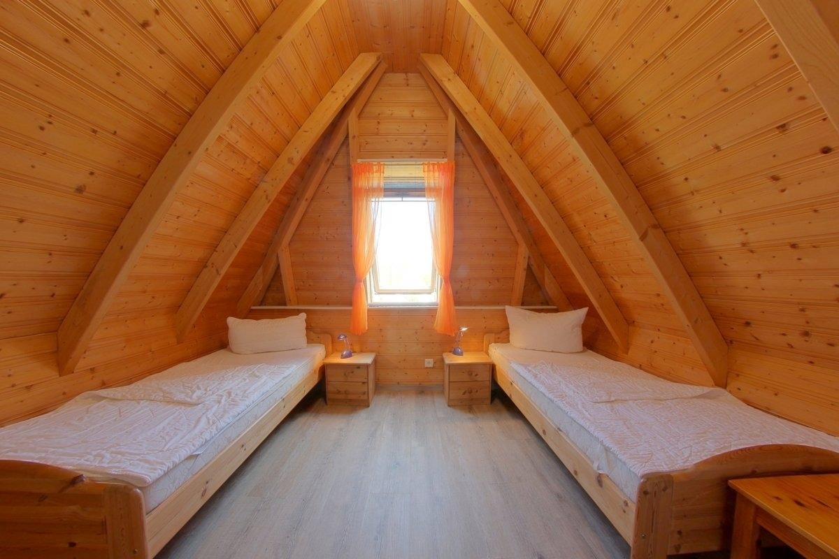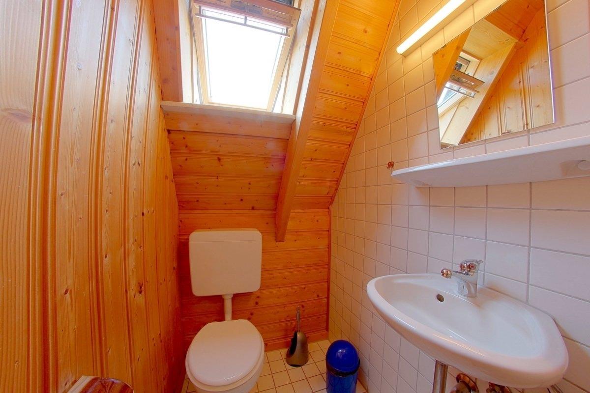 Im Obergeschoss befinden sich zwei weitere Schlafzimmer mit wischbaren Böden und ein WC mit Waschbecken. Ein Schlafzimmer mit Doppelbett und ein weiteres Schlafzimmer mit 2 Einzelbetten.