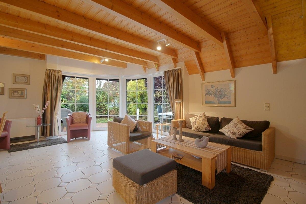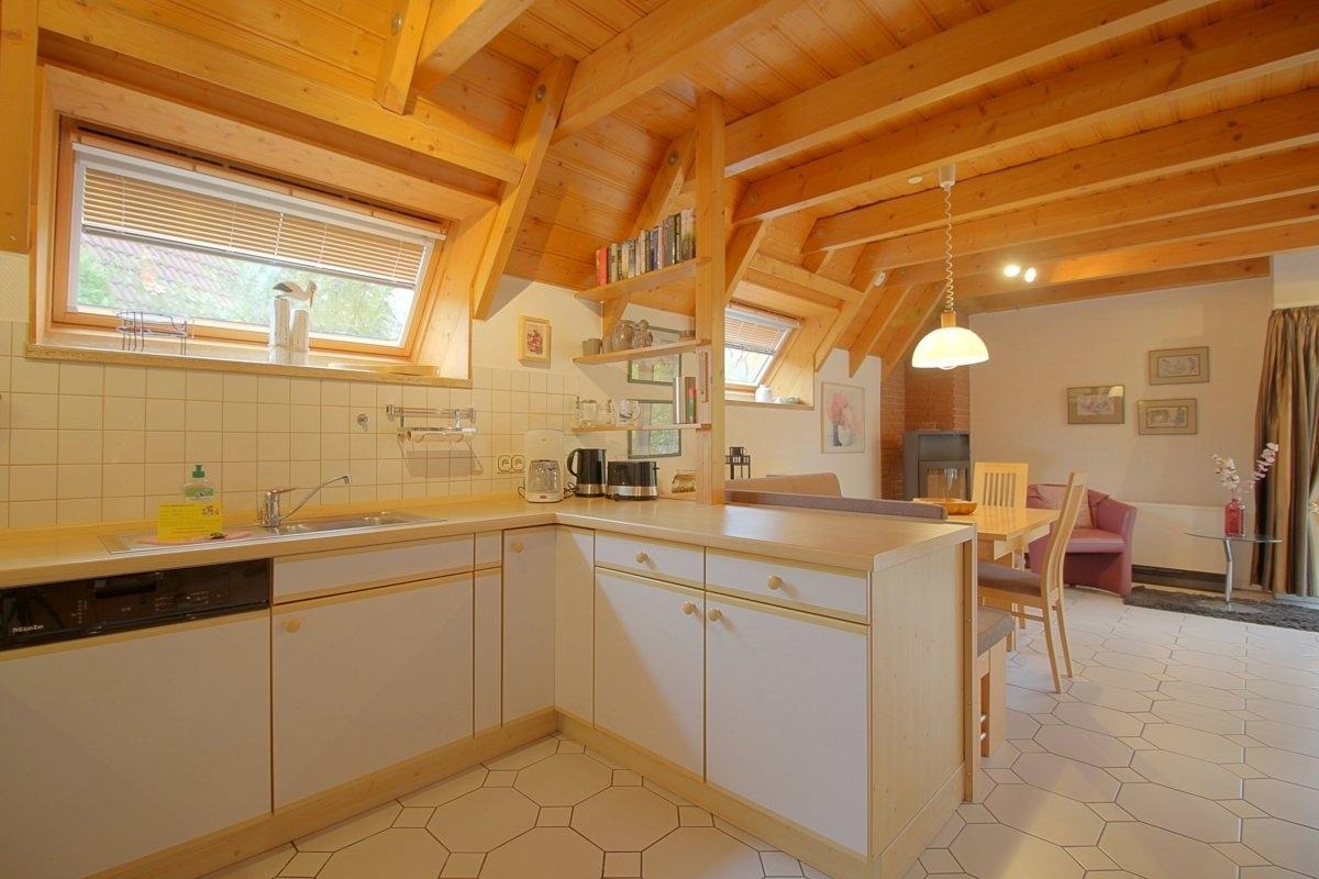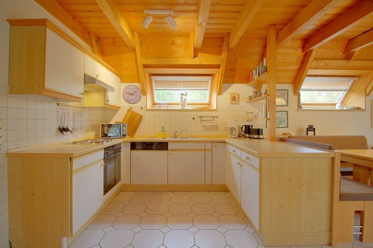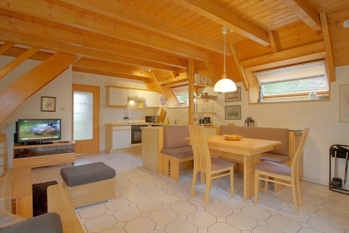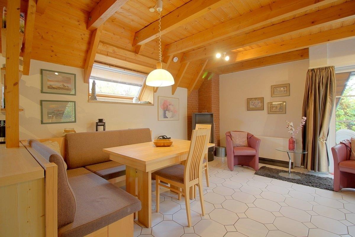 Im gefliesten Erdgeschoss mit offenem Wohn-, Ess- und Küchenbereich ist Platz für die ganze Familie. Gemütliche Sitzmöbel , eine geräumige Essecke mit Eckbank und eine voll ausgestattete Küche stehen Ihnen hier zur Verfügung. Großer Flat-TV 55 Zoll und ein Kaminofen für die kühle Jahreszeit, sowie kostenloses schnelles Internet mit Glasfaserkabel machen Ihnen den Aufenthalt so angenehm wie möglich.