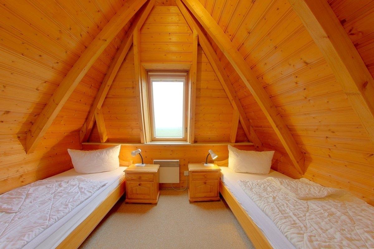 Im oberen Bereich befinden sich ein Schlafzimmer mit Doppelbett und ein Schlafzimmer mit 2 Einzelbetten, sowie ein weiteres WC. Die Schlafräume haben Teppichböden.