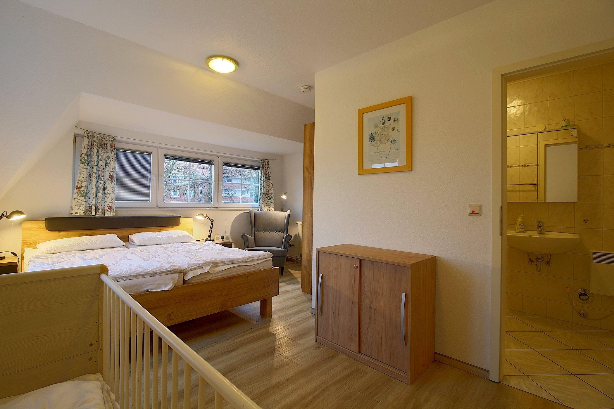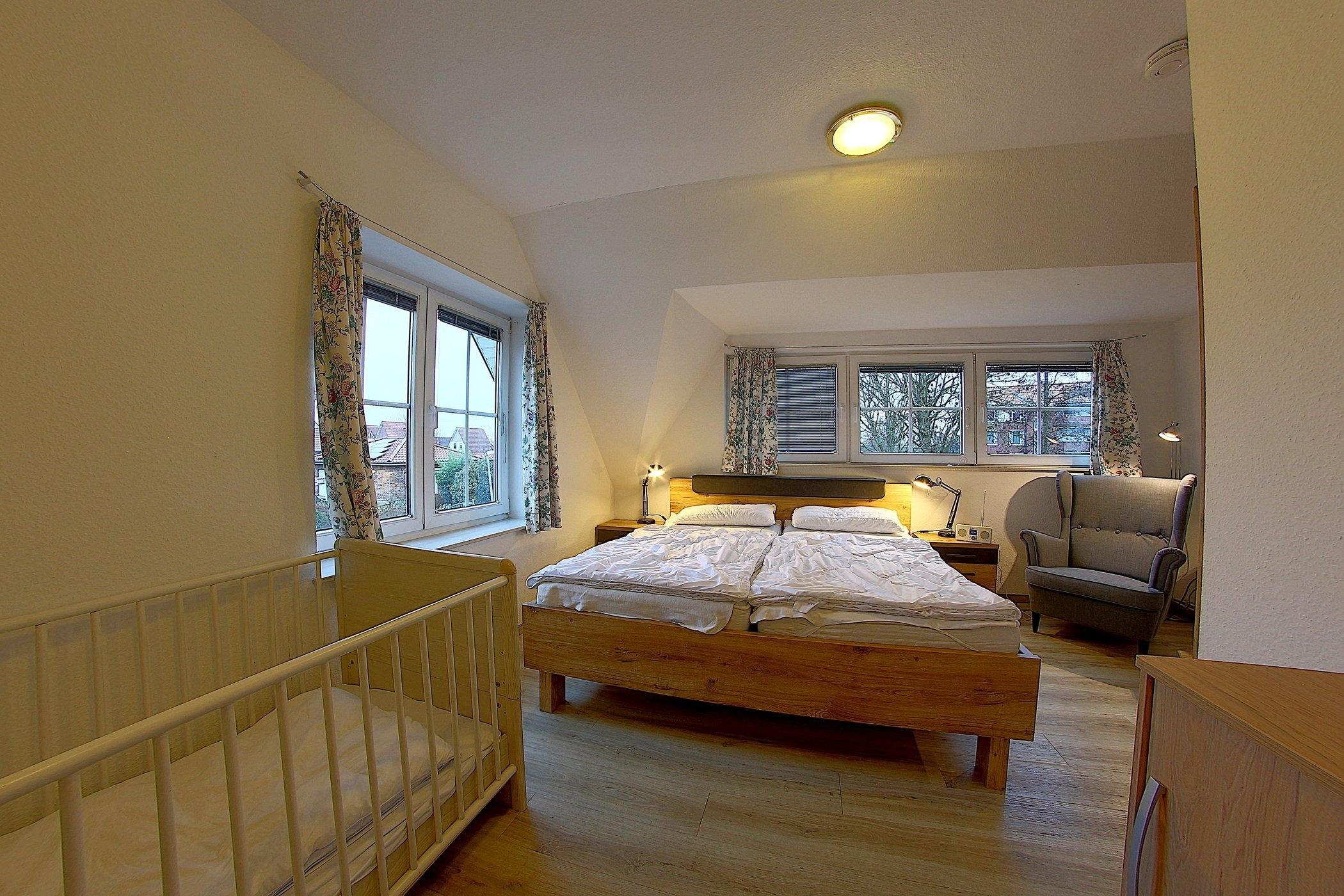 Im Obergeschoss befinden sich 2 geräumige Schlafzimmer mit jeweils einem Doppelbett (1,80 x 2 m) und einem Kleiderschrank. Im größeren Schlafraum steht zusätzlich ein Kinderbett. Daneben gibt es ein zweites Duschbad, das von jedem der beiden Schlafzimmeraus direkt betreten werden kann. Die Schlafzimmer sind mit Vinylbodenbelägen ausgestattet.