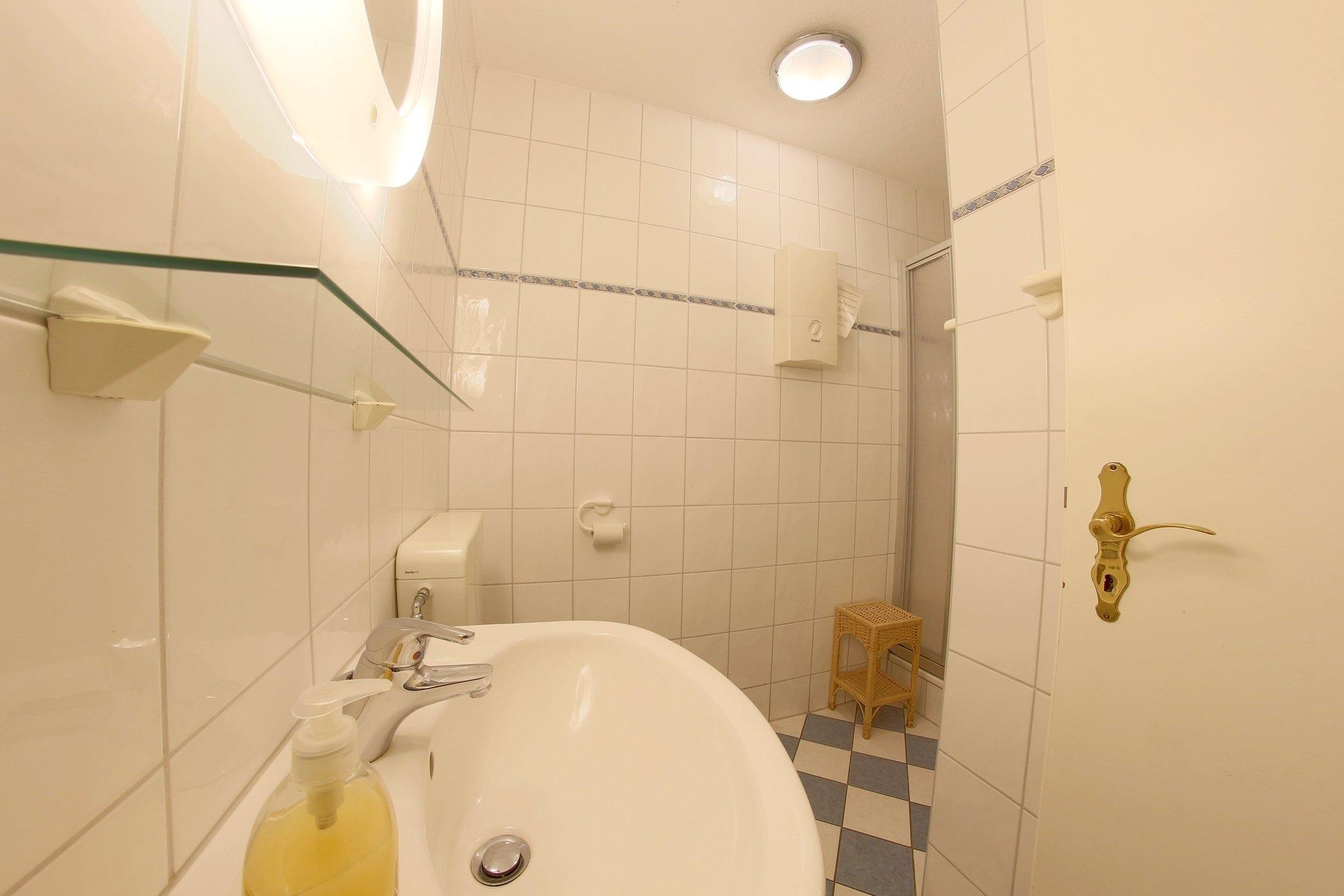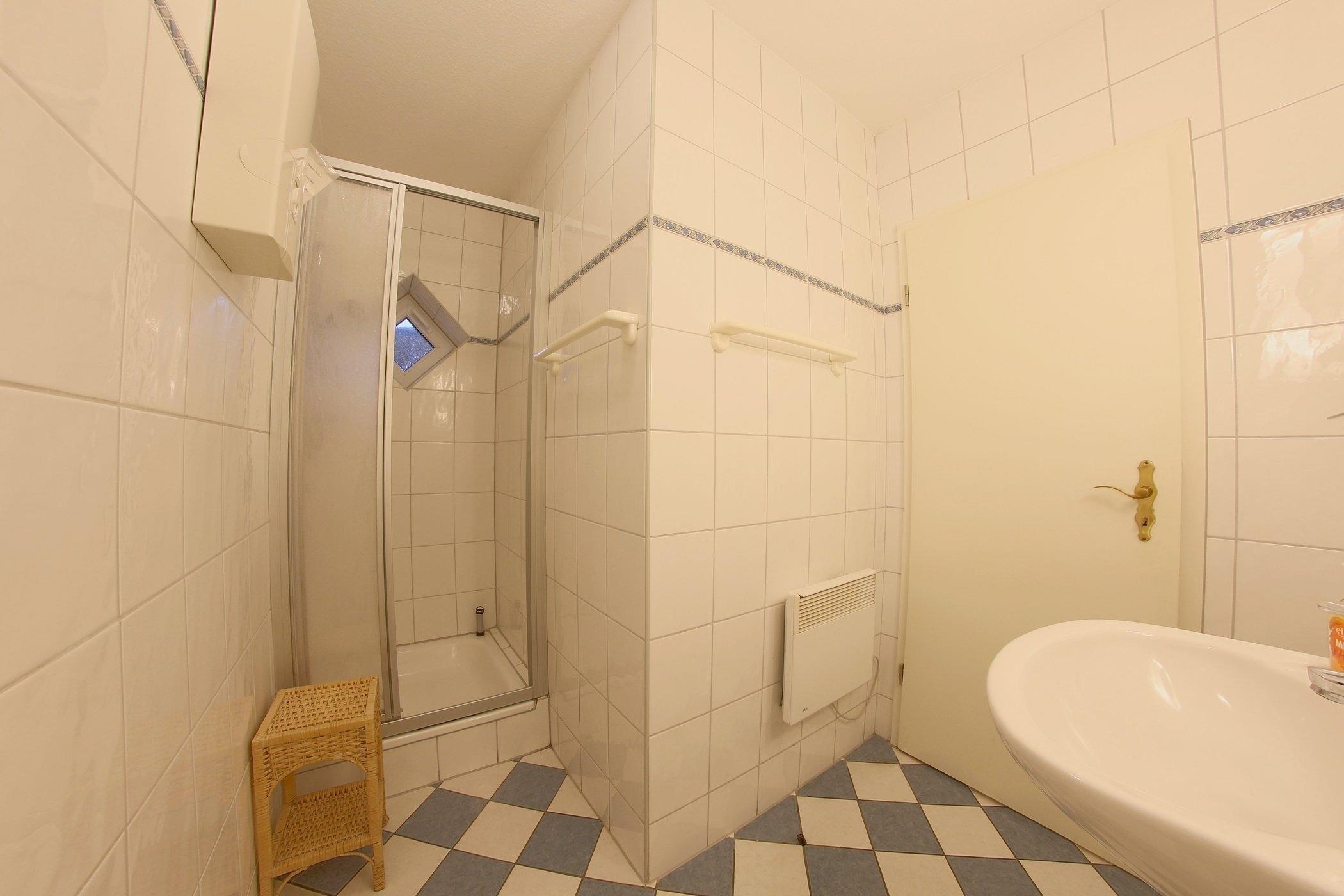 Eine kleine separate Küche und ein Duschbad befinden sich ebenfalls im Erdgeschoss. Außerdem gibt es einen Abstellraum mit Waschmaschine.