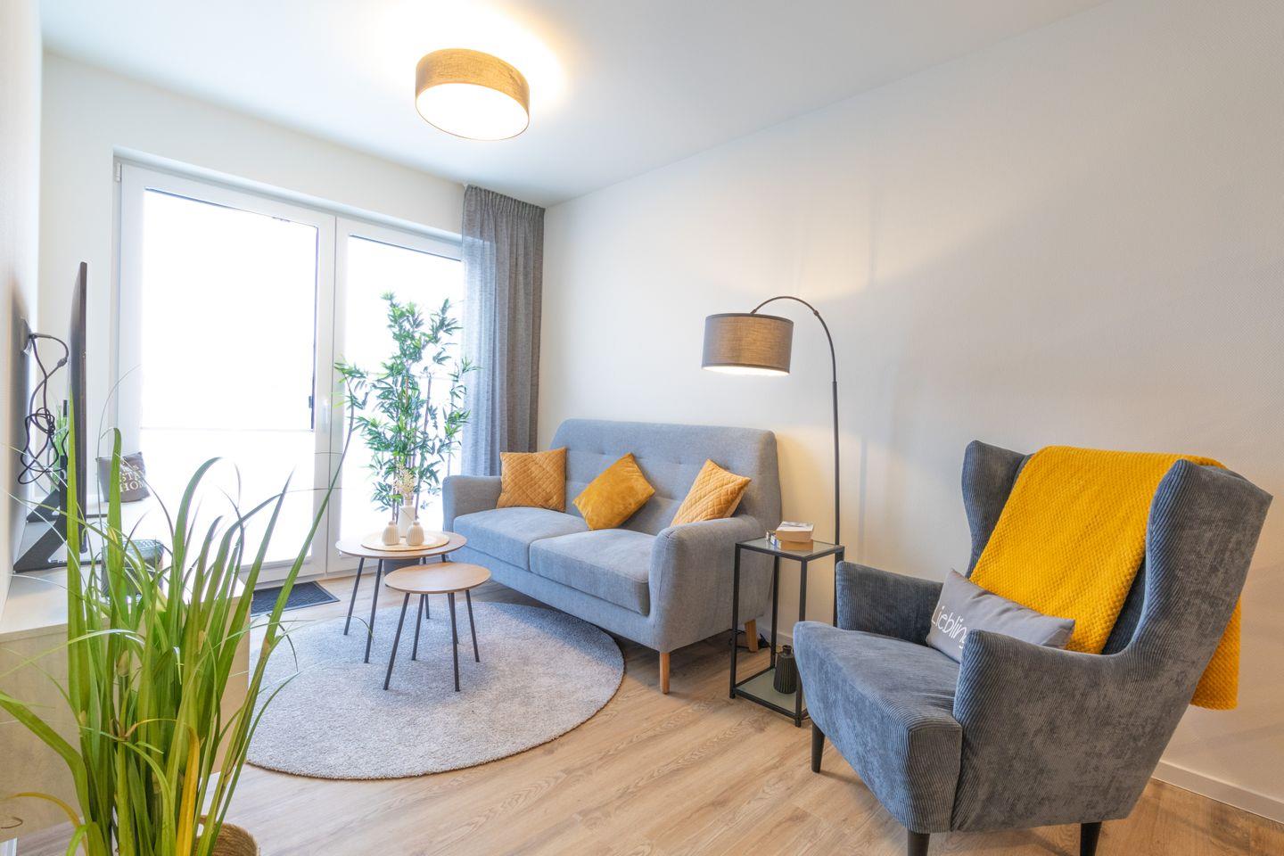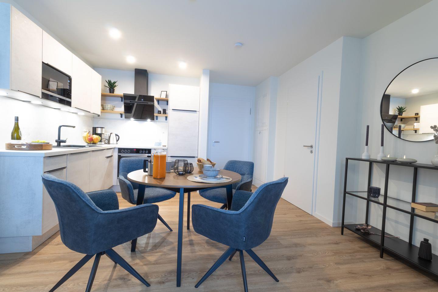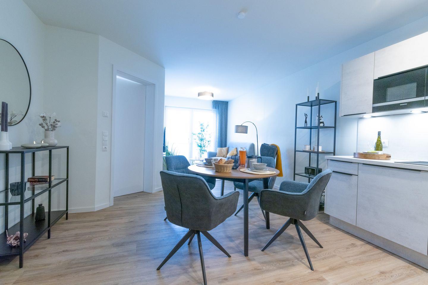 Im offenen, hellen Wohnbereich findest du Platz zum Entspannen und Genießen. Die gemütliche Sitzecke, große Fenster und der Zugang zum sonnigen Balkon schaffen eine freundliche Atmosphäre. Die offene Küche mit liebevollen Details, Markengeräten und rundem Esstisch macht Lust auf gemeinsames Kochen – ein Ort für Genuss und Geselligkeit.