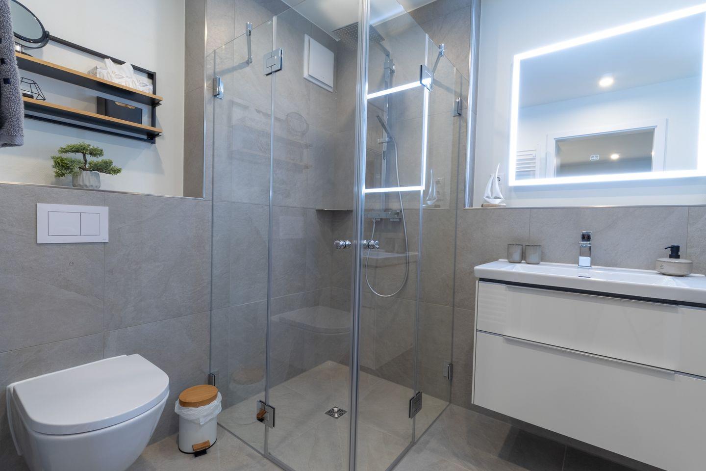 Das moderne Badezimmer wird zur kleinen Wellnessoase. Freu dich auf eine bodentiefe Dusche und deine eigene Sauna – perfekt, um den Tag wohlig ausklingen zu lassen.