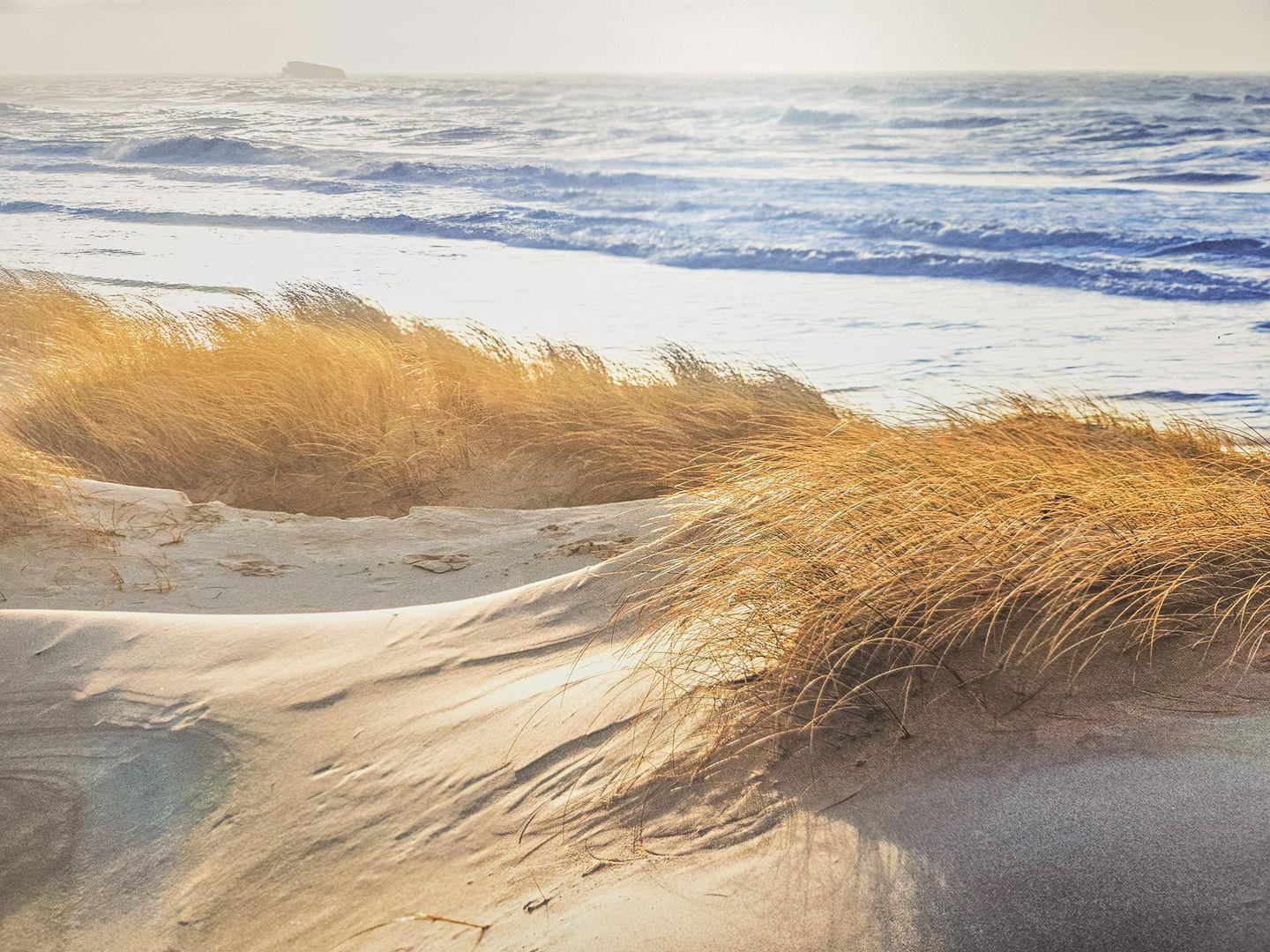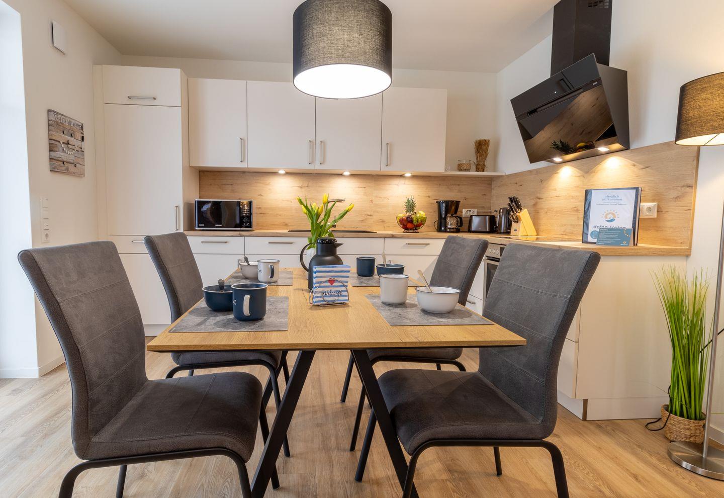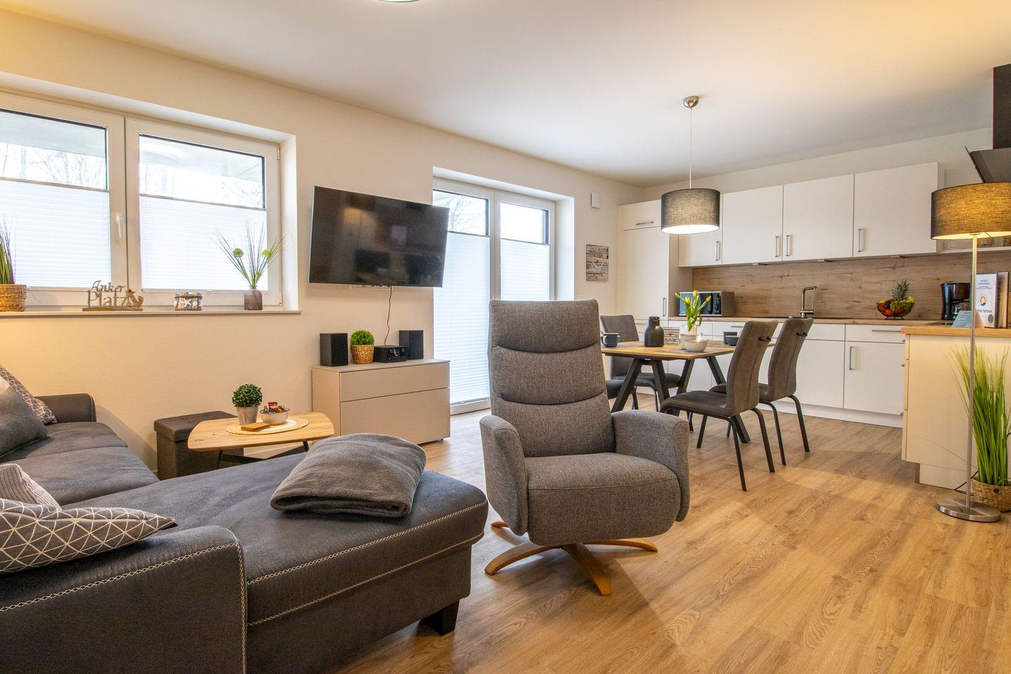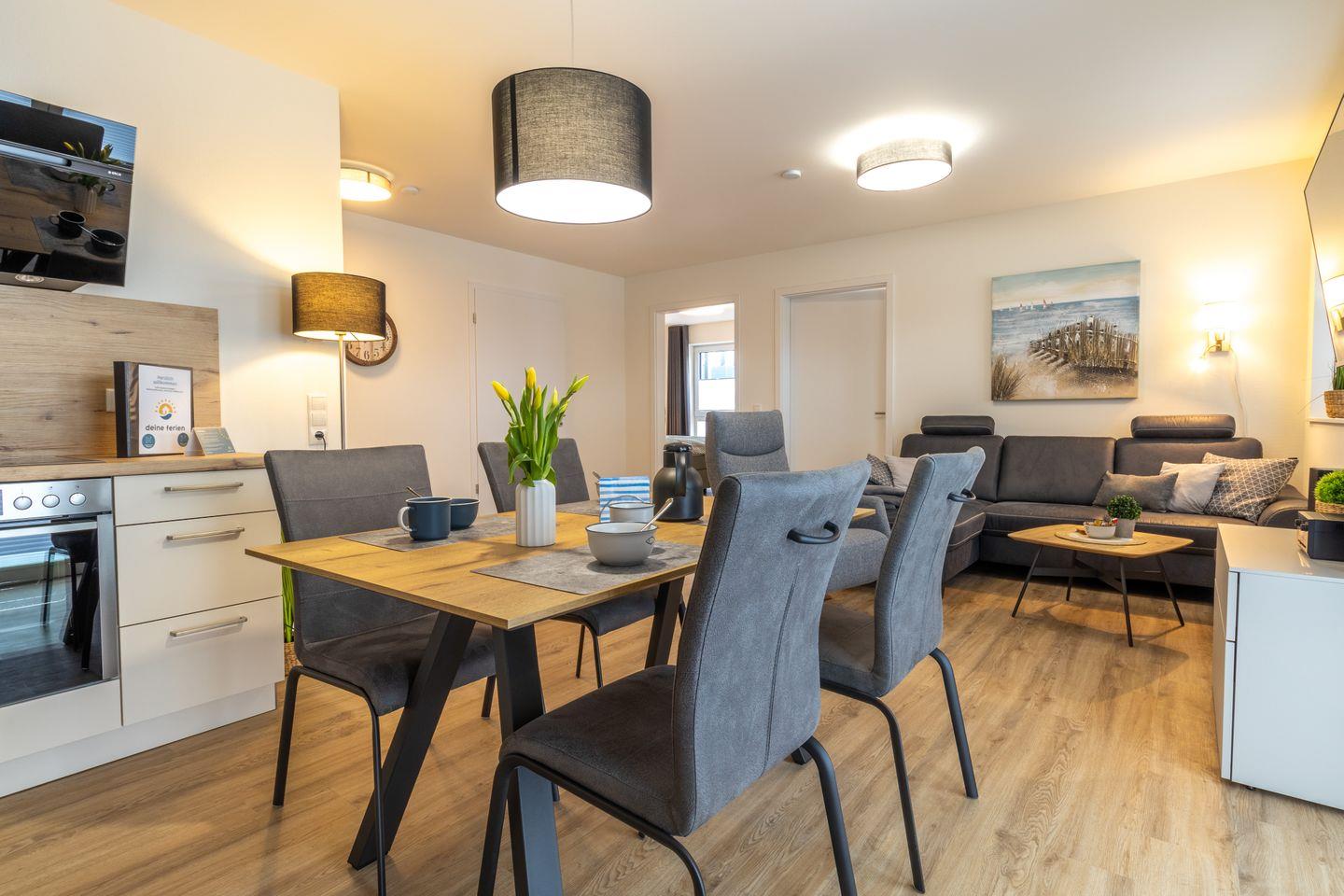 Der offene Wohnbereich lädt mit seinem gemütlichen Sofa, einem Smart-TV und einem Essbereich zum Entspannen ein. Durch die große Fensterfront fällt viel Licht, und die möblierte Terrasse ist direkt zugänglich – hier genießt du die Nordseeluft in vollen Zügen.