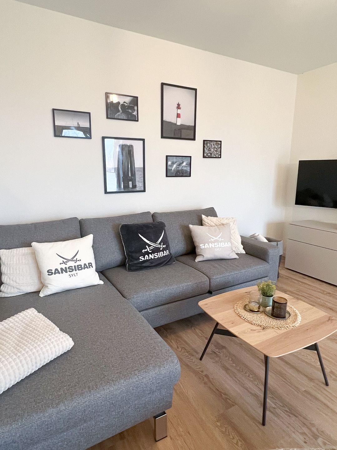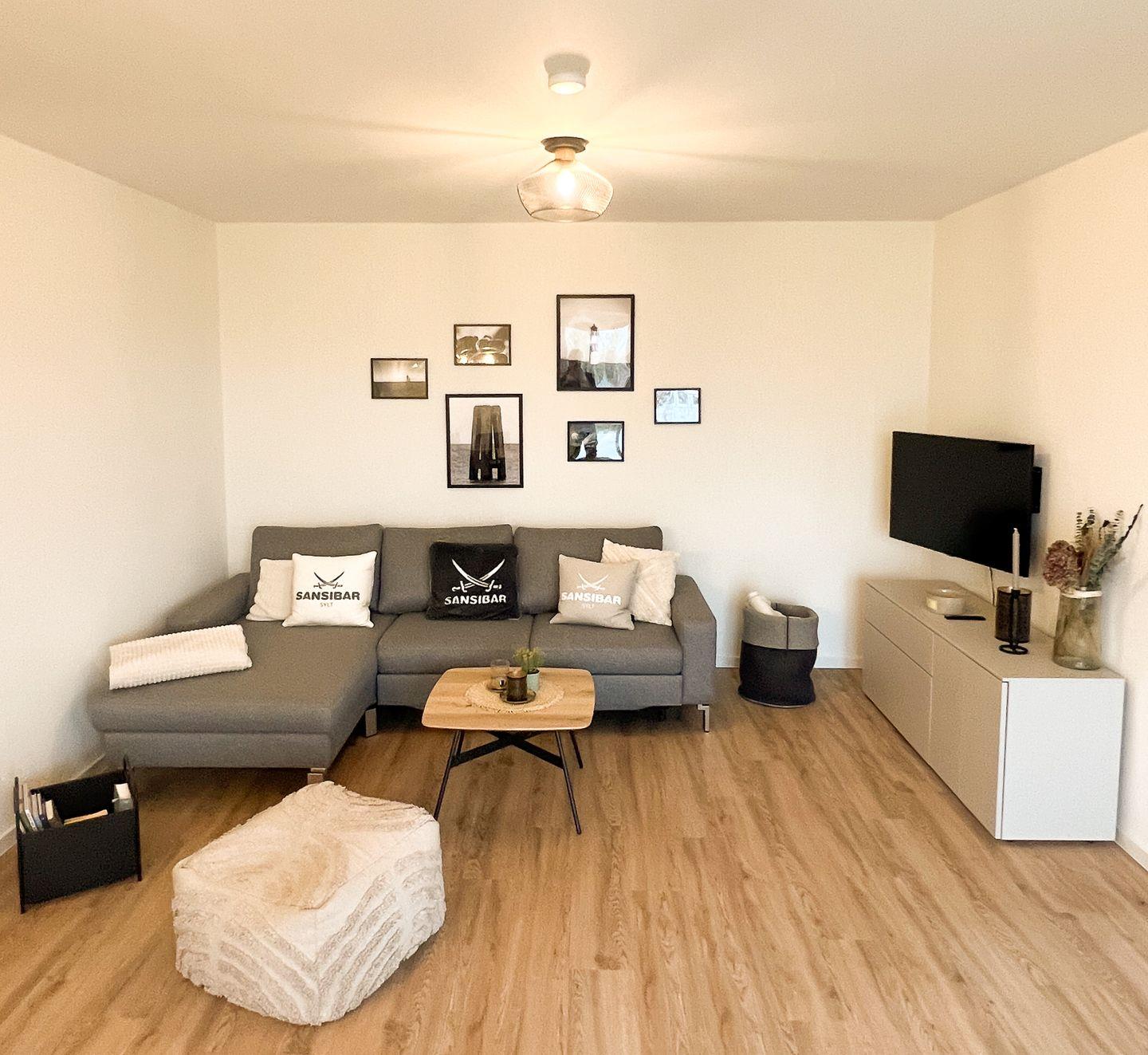 Der lichtdurchflutete Wohnbereich lädt mit einer bequemen Couch, Flachbild-TV und Essplatz zum Verweilen ein. Von hier aus gelangst du direkt auf den überdachten Balkon – ein schöner Ort für Kaffee oder ein Buch mit Aussicht ins Grüne.