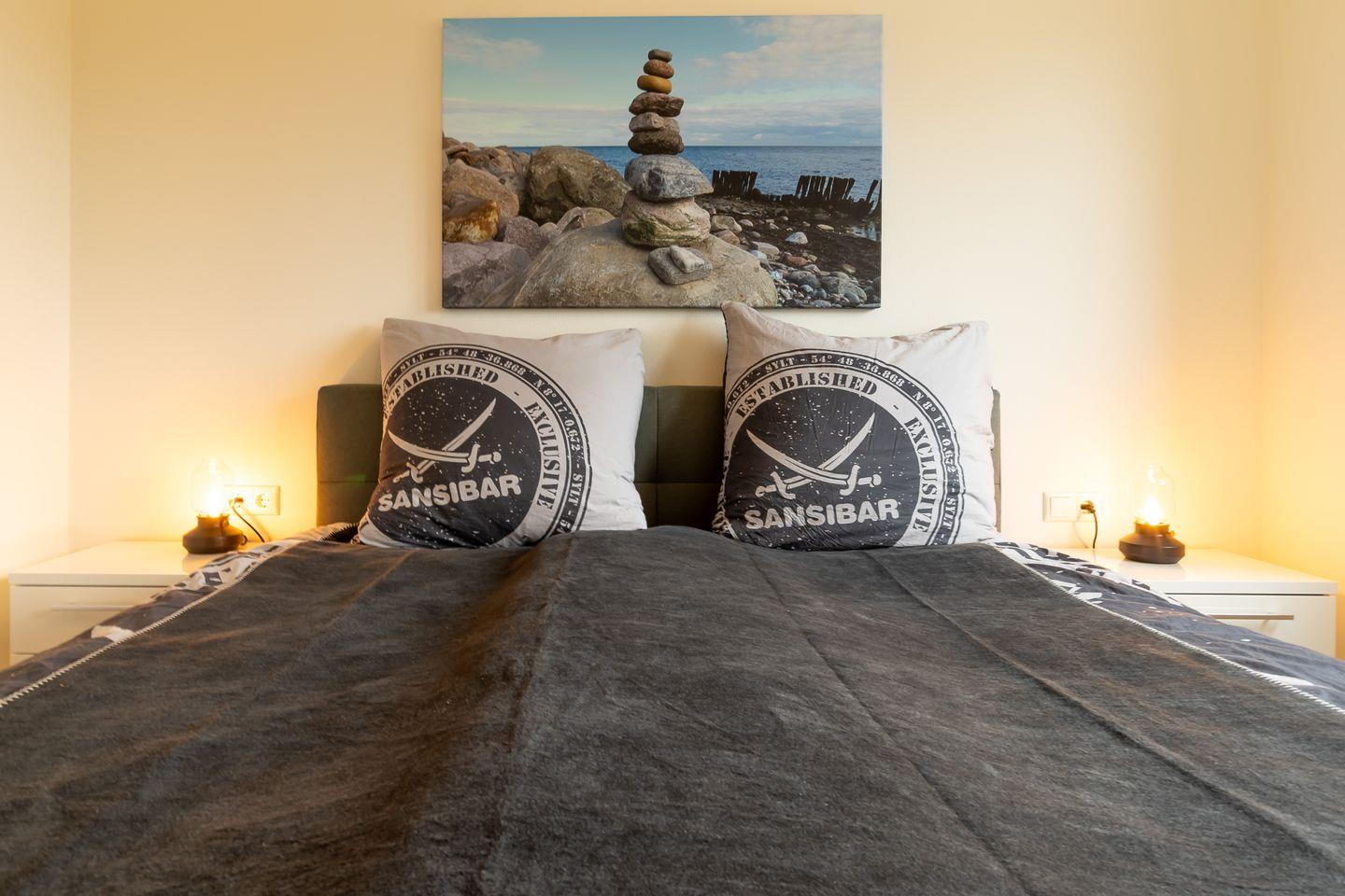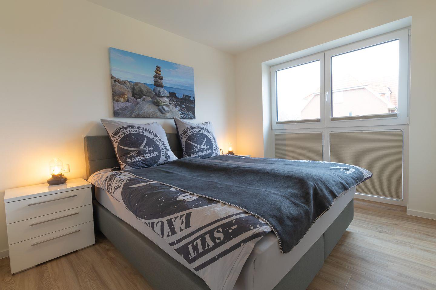 Das separate Schlafzimmer ist mit einem komfortablen Doppelbett ausgestattet und bietet ausreichend Stauraum für dein Gepäck. Auch hier sorgen helle Töne und nordisches Flair für Wohlfühlatmosphäre.