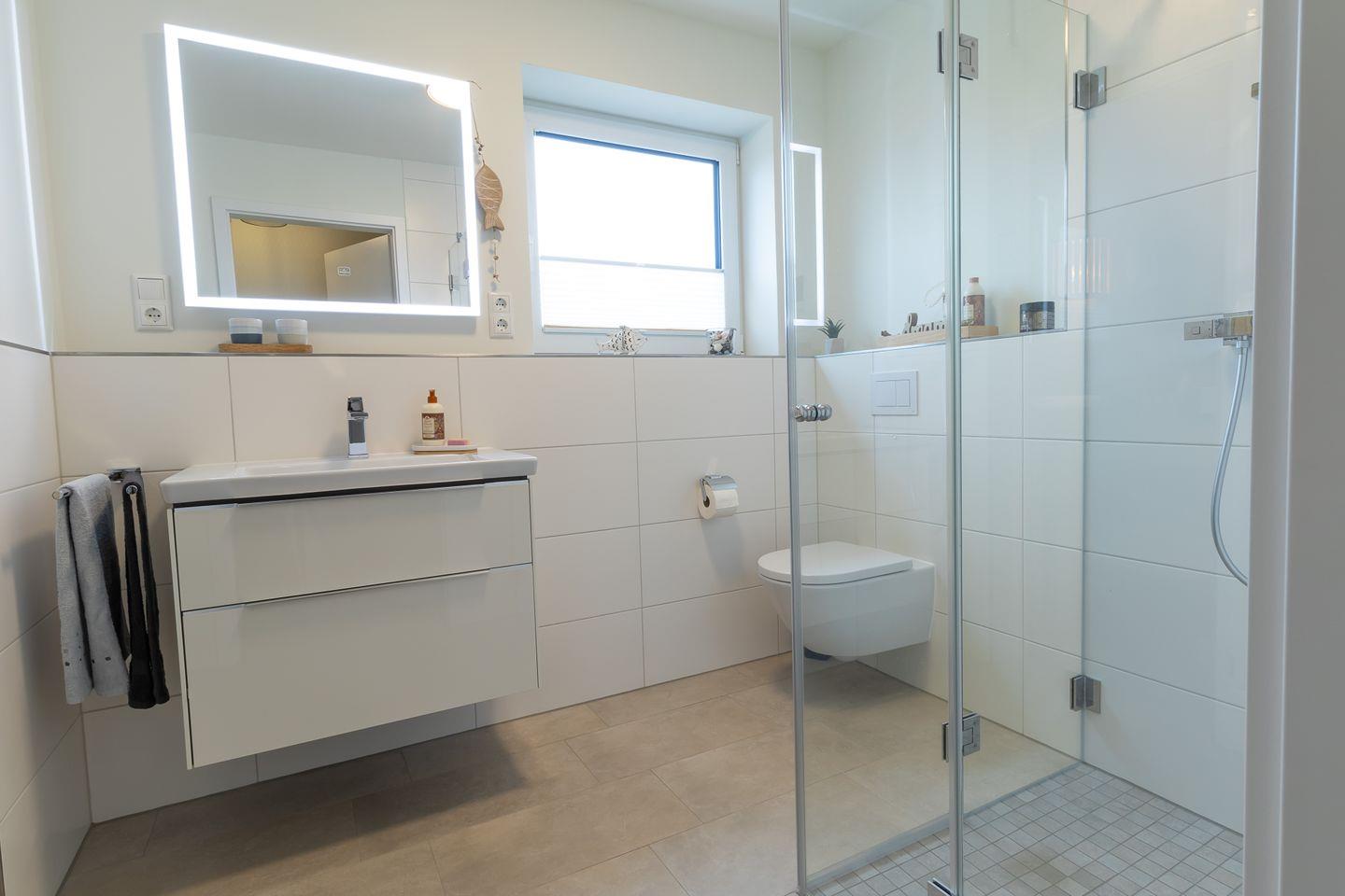 Das moderne Bad verfügt über eine Dusche, Waschbecken, WC und Tageslicht – ideal für einen frischen Start in den Tag.