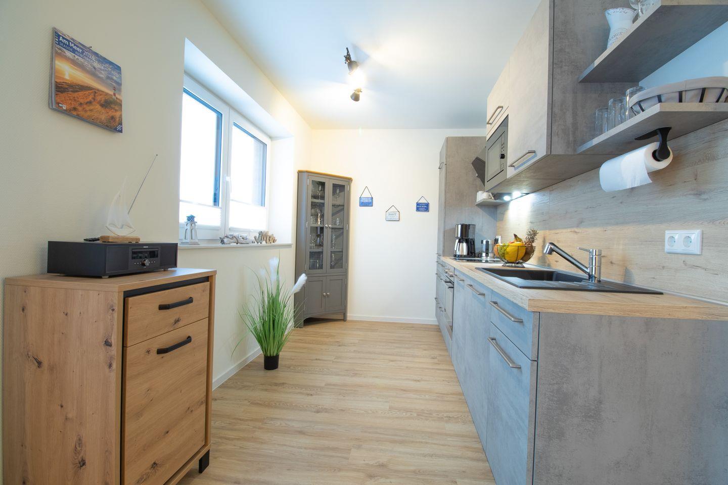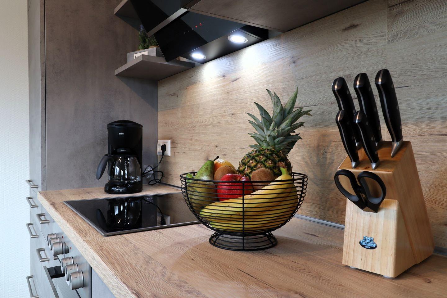 Die Küche ist sehr gut ausgestattet. Du findest Herd, Backofen, Geschirrspüler, Kaffeemaschine und genug Platz zum Kochen. Am gemütlichen Esstisch sitzt ihr gemeinsam zum Essen, unterhalten und Spiele spielen.